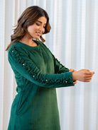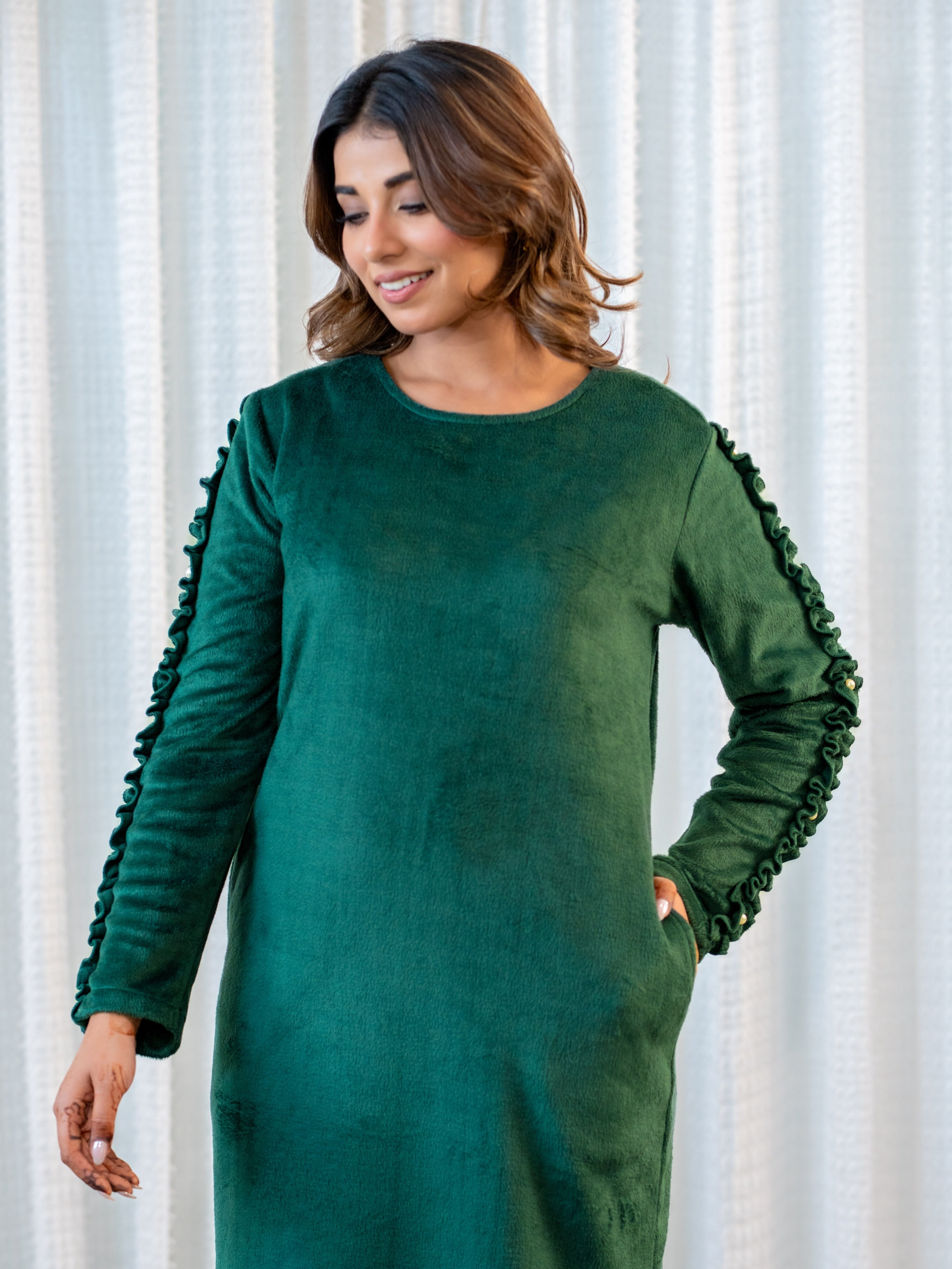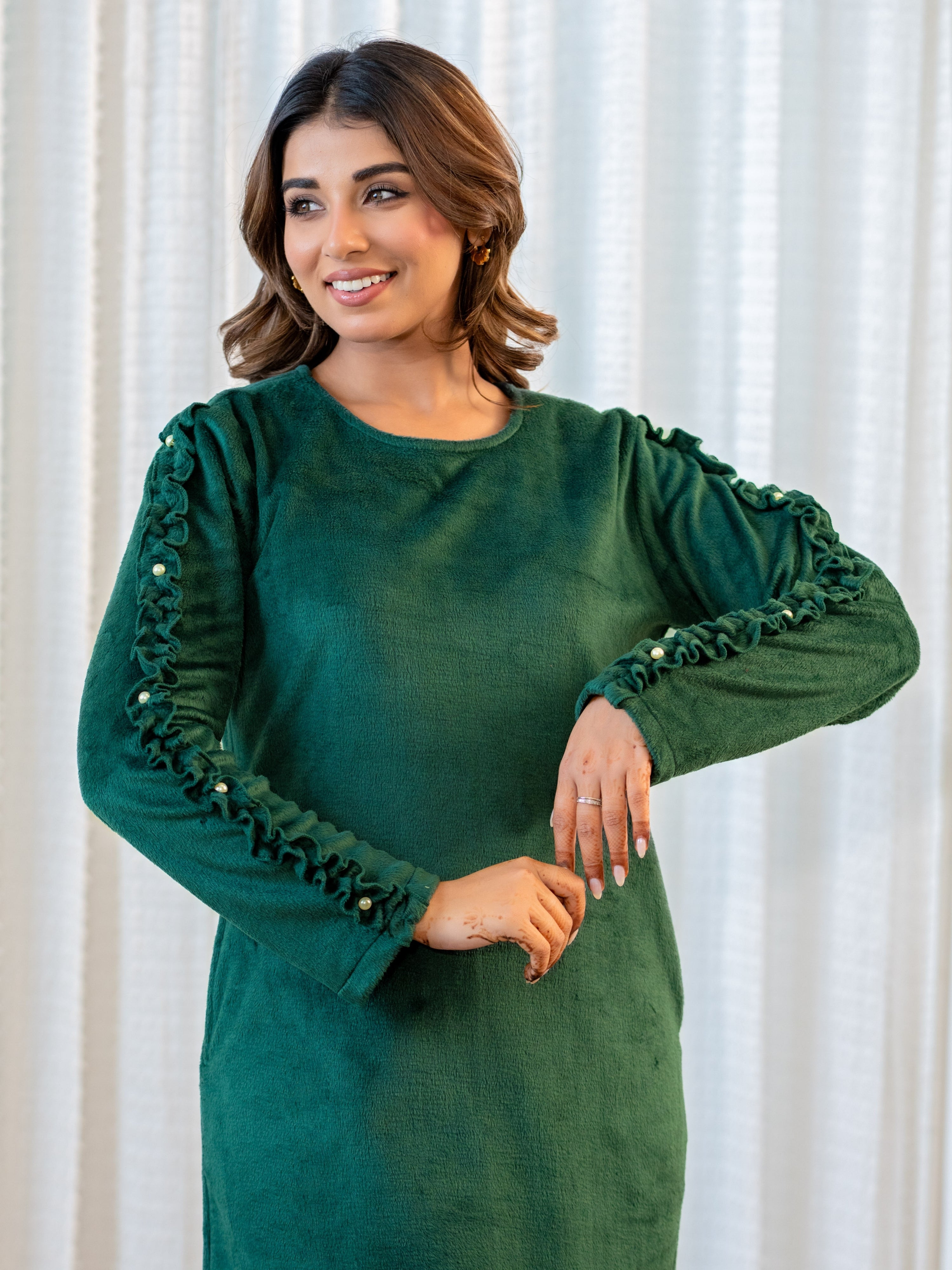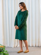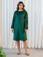 Dive into emerald dreams with this super soft woollen midi dress! Ruffle sleeves add a playful flair while premium wool keeps you cozy and stylish. A versatile piece that transitions seamlessly from casual to chic.
