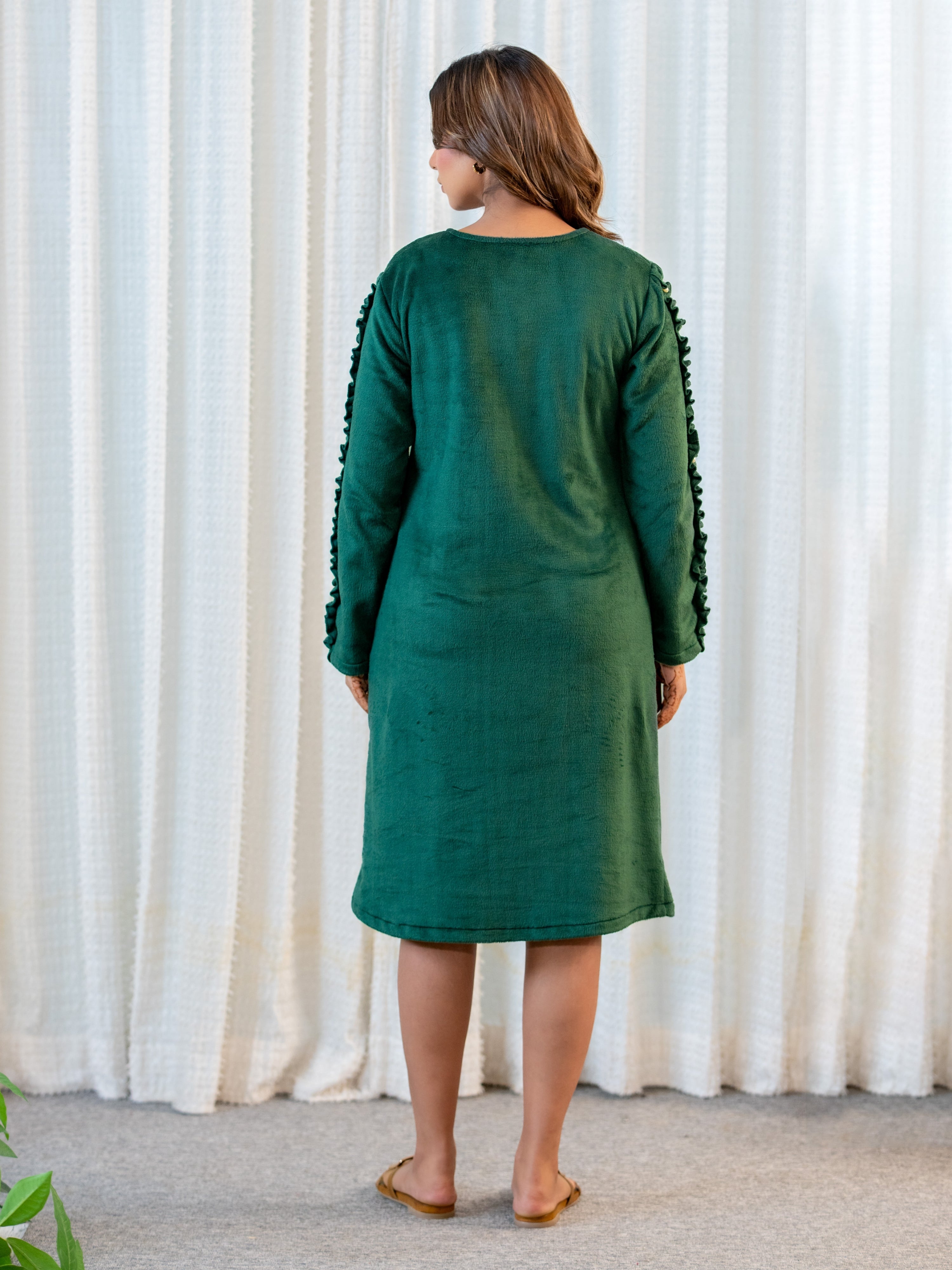 Super Soft Emeraled Green Woollen Ruffle Sleeve Midi Dress