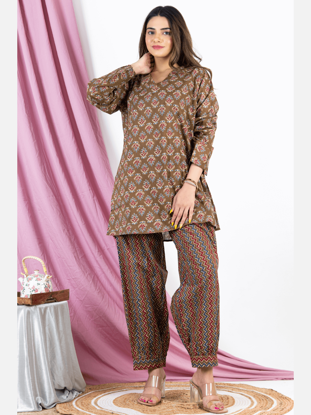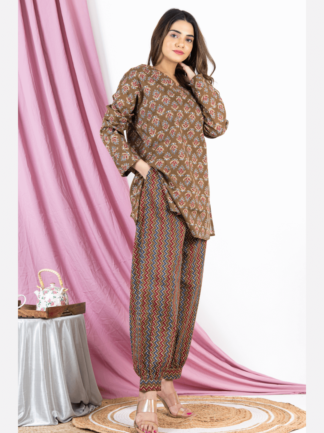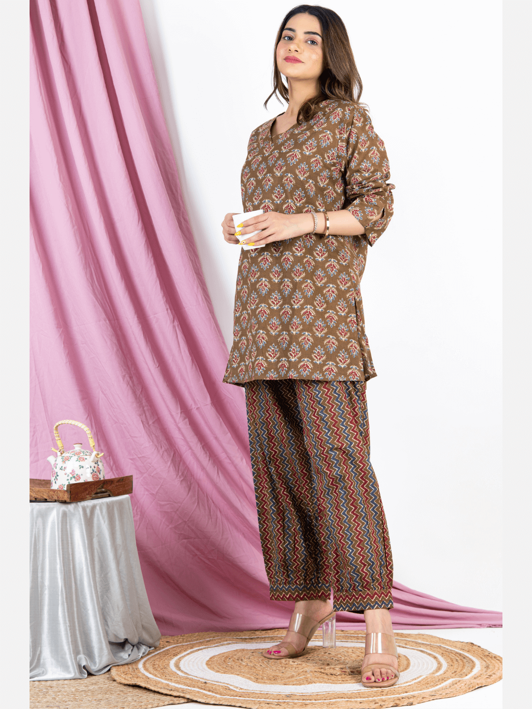 An ideal choice for your loungewear wardrobe, the Cotton Set comes in a soothing color palette. The hand block-printed pattern of the breezy Cotton top complements the matching Pants perfectly.