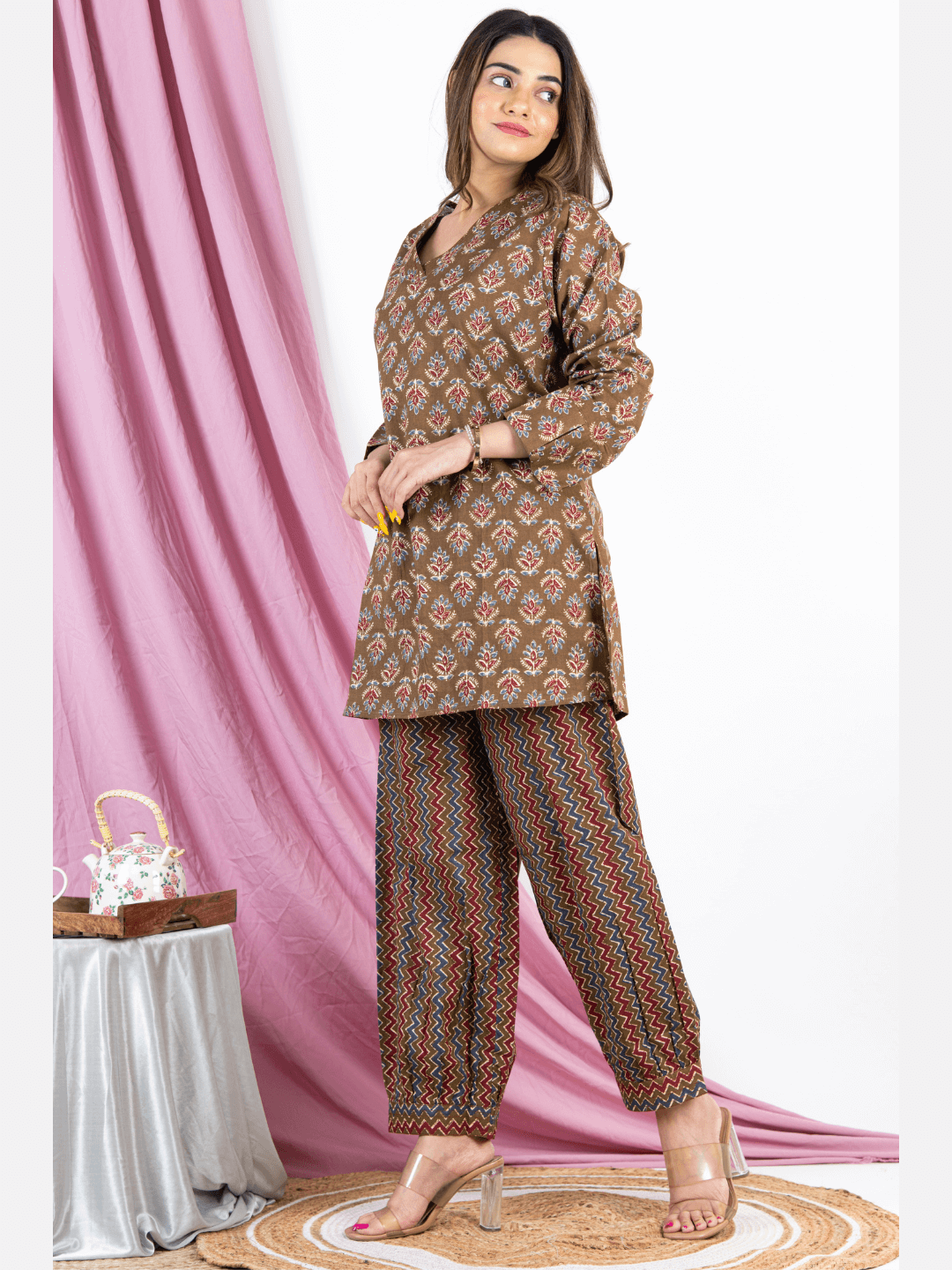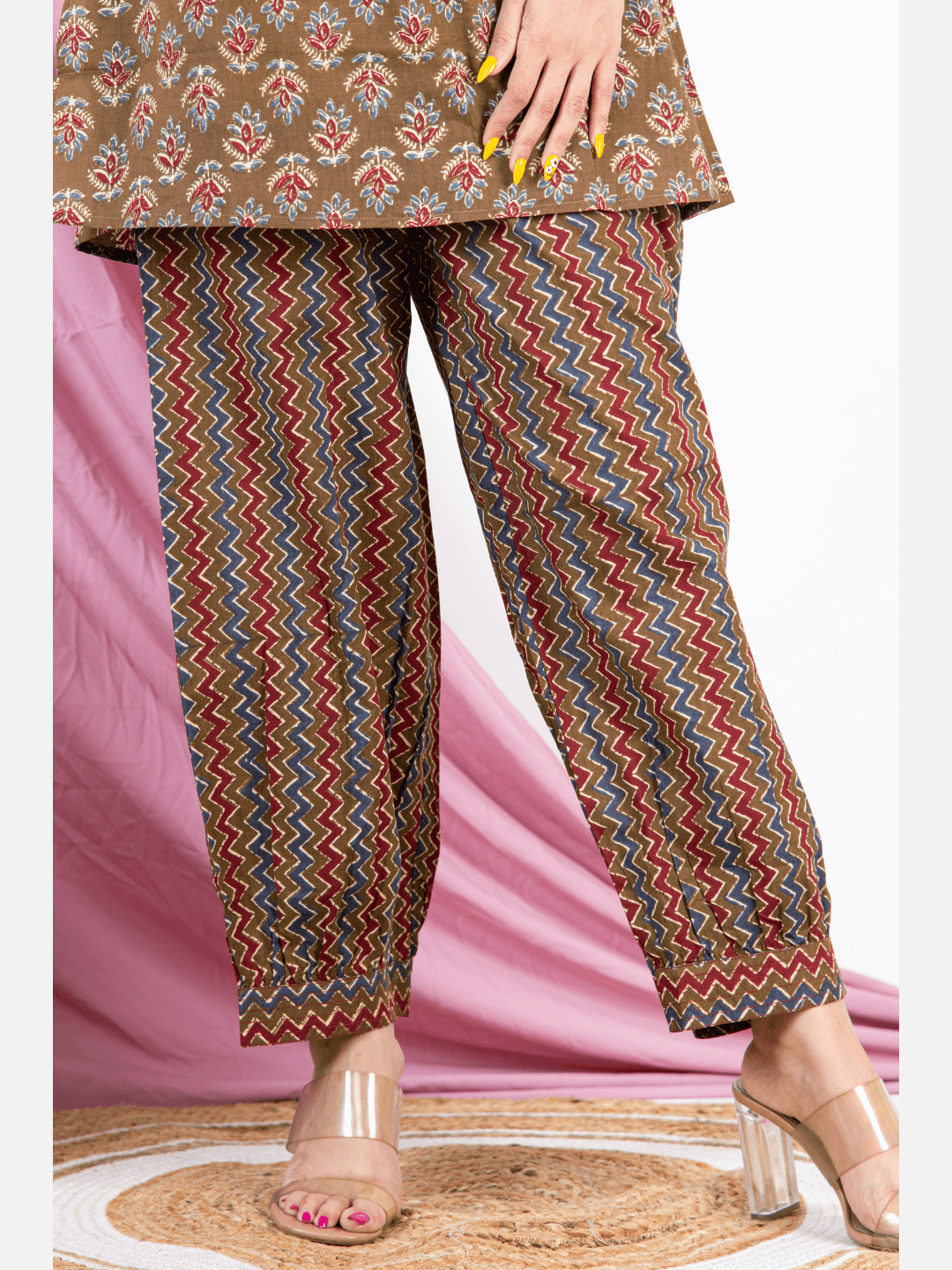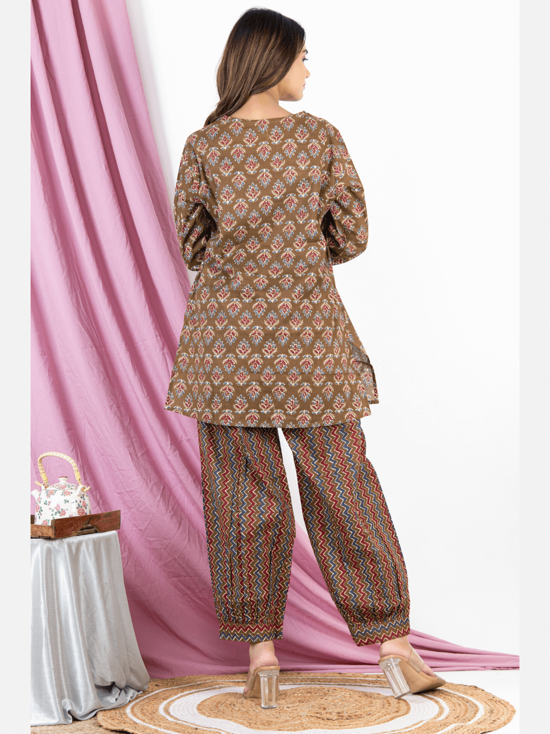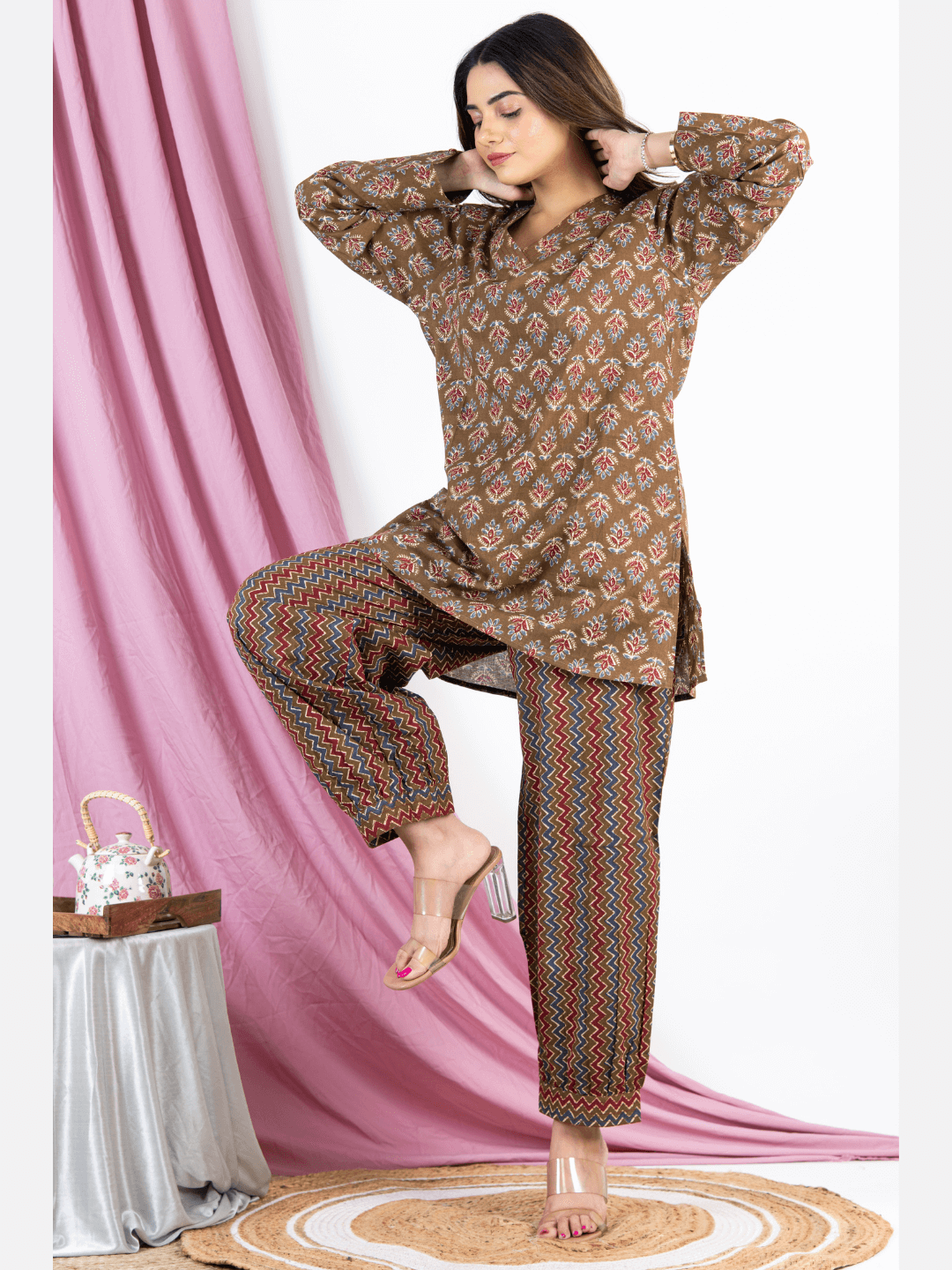 An ideal choice for your loungewear wardrobe, the Cotton Set comes in a soothing color palette. The hand block-printed pattern of the breezy Cotton top complements the matching Pants perfectly.