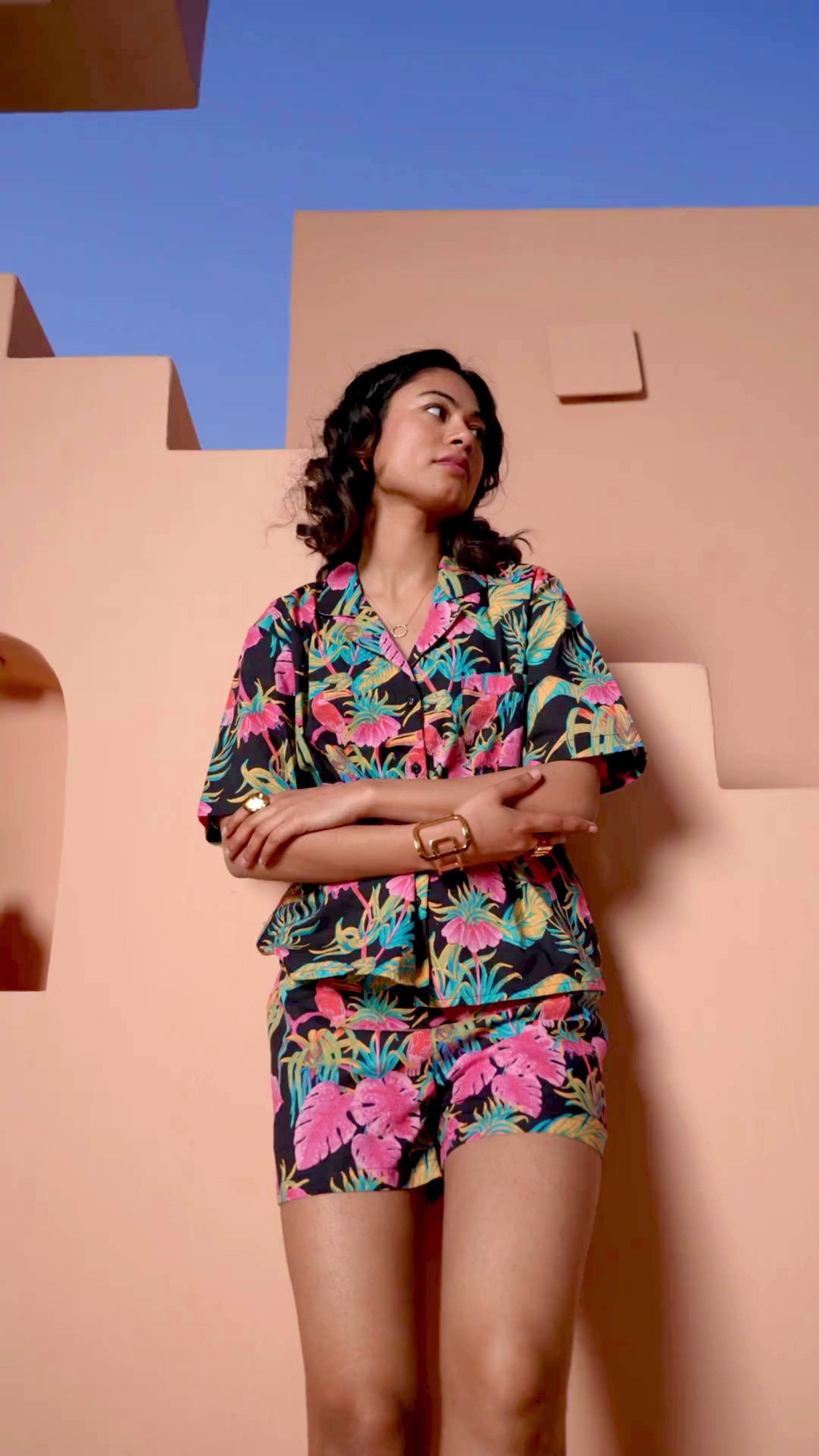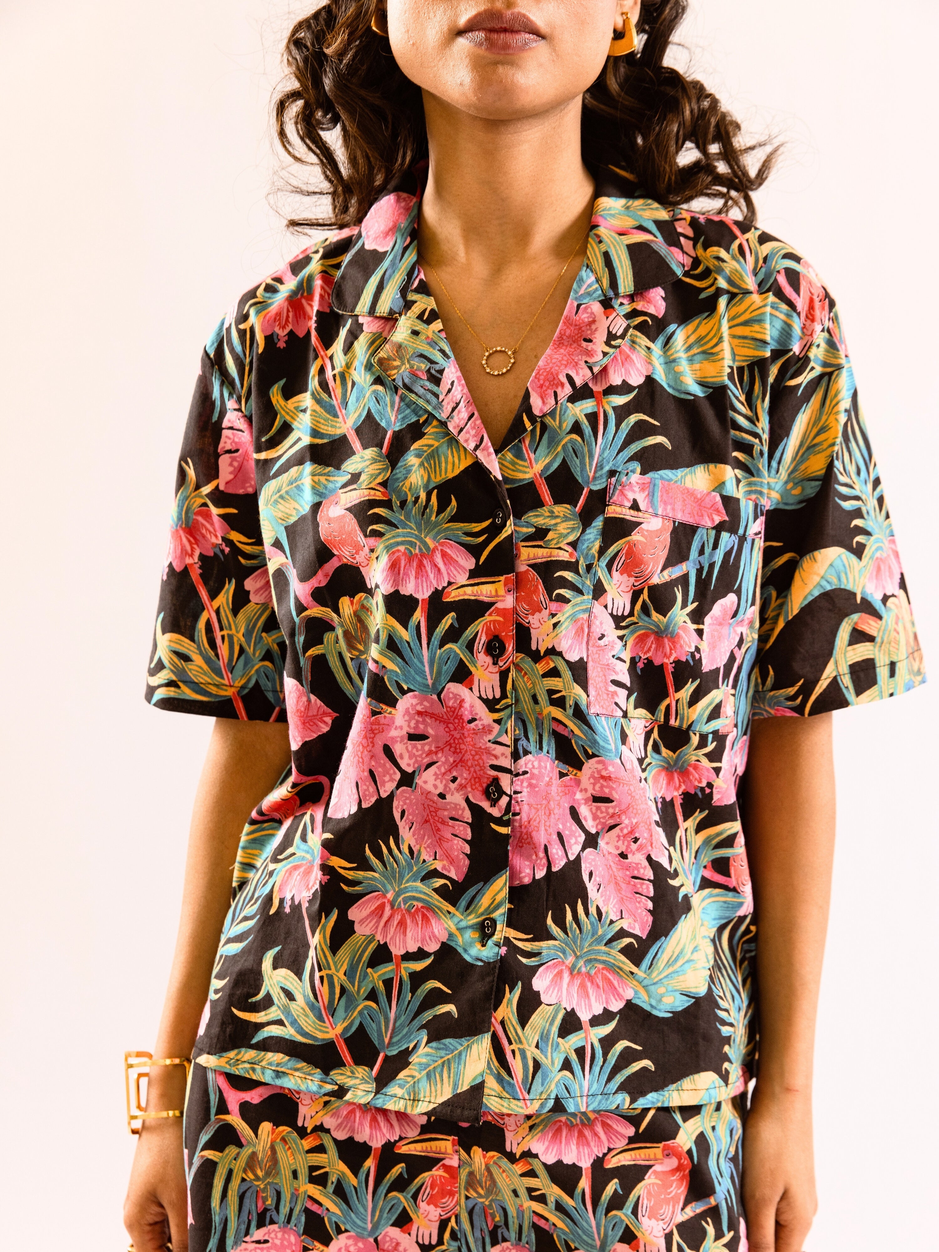 Bloom stylishly in our Black Botanic Bliss pure cotton Collar co-ord set. Head-turning chic botanical print and comfortable fit for a day in the sun. Be bold and embrace your individual style with this trendy set.