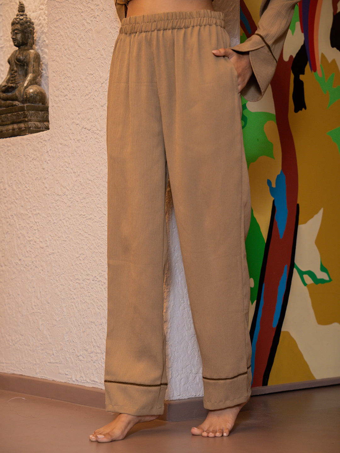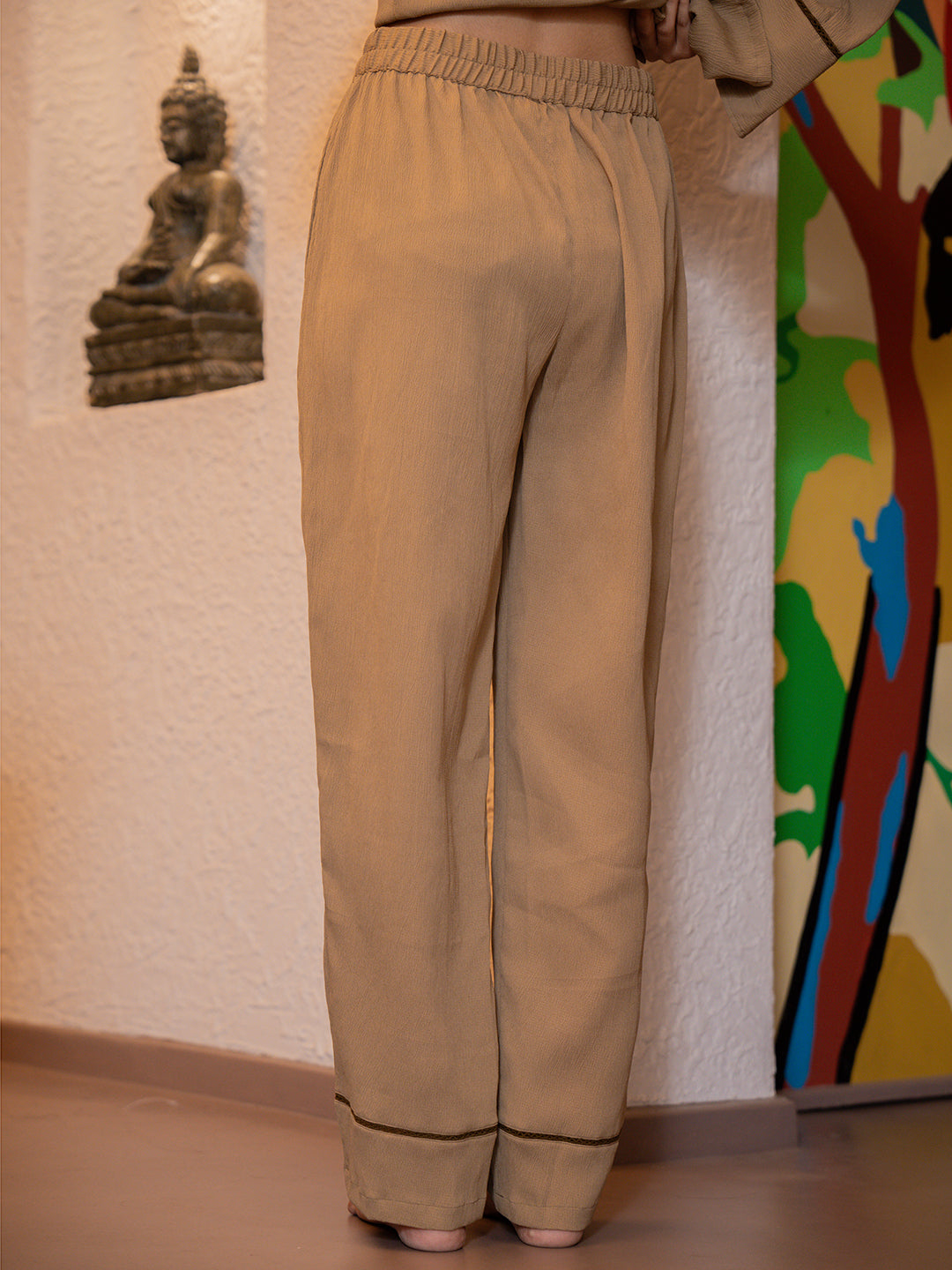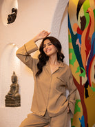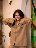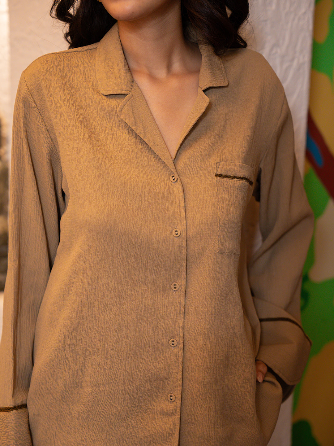 Experience ultimate comfort and style with our Cocoa Brown Soft Crepe Night Suit. Made with soft crepe fabric, this night suit is perfect for a cozy and relaxing night's sleep. Stay trendy and comfortable with this must-have addition to your sleepwear collection.