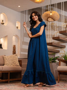 Slip into this playful Teal Blue Flared Soft Crepe Night Maxi and drift off into sweet dreams. Made with soft crepe fabric, the flared design provides ultimate comfort while the vibrant teal blue color adds a touch of fun to your nightwear. A must-have for any quirky sleeper.