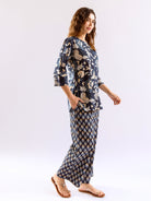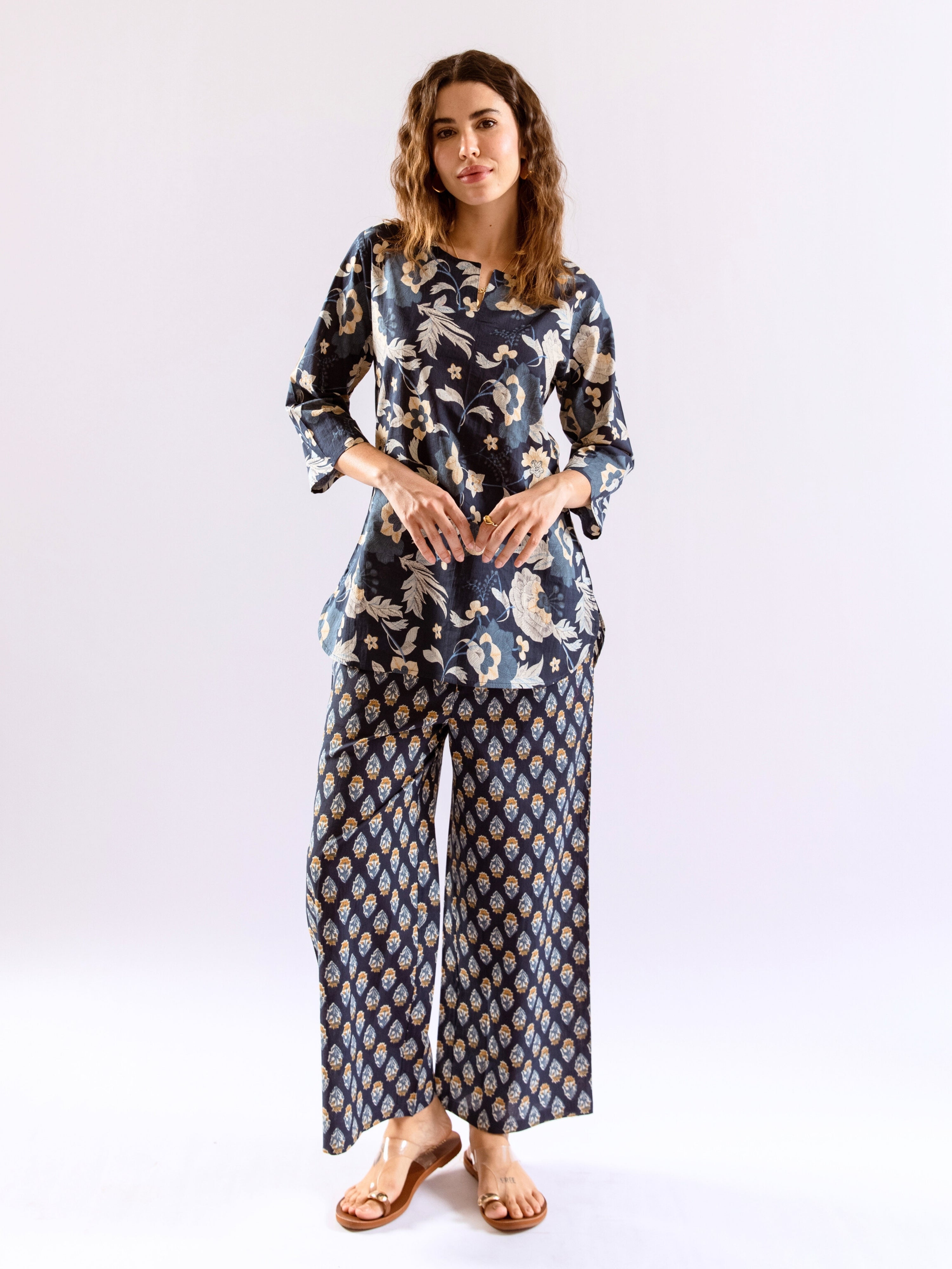 Navy Blue Petal Hush Print Pure Cotton Round neck Co-ord set