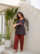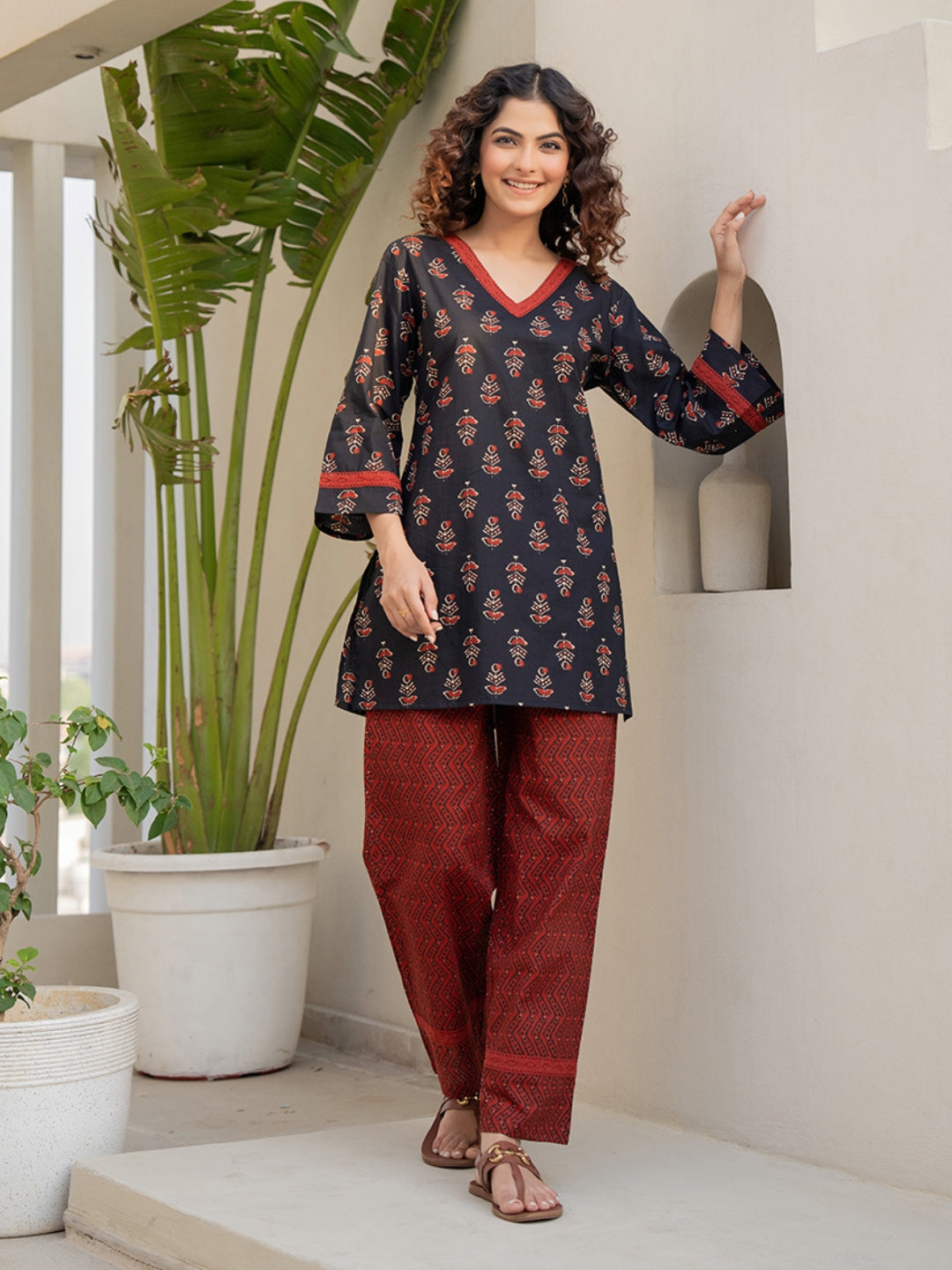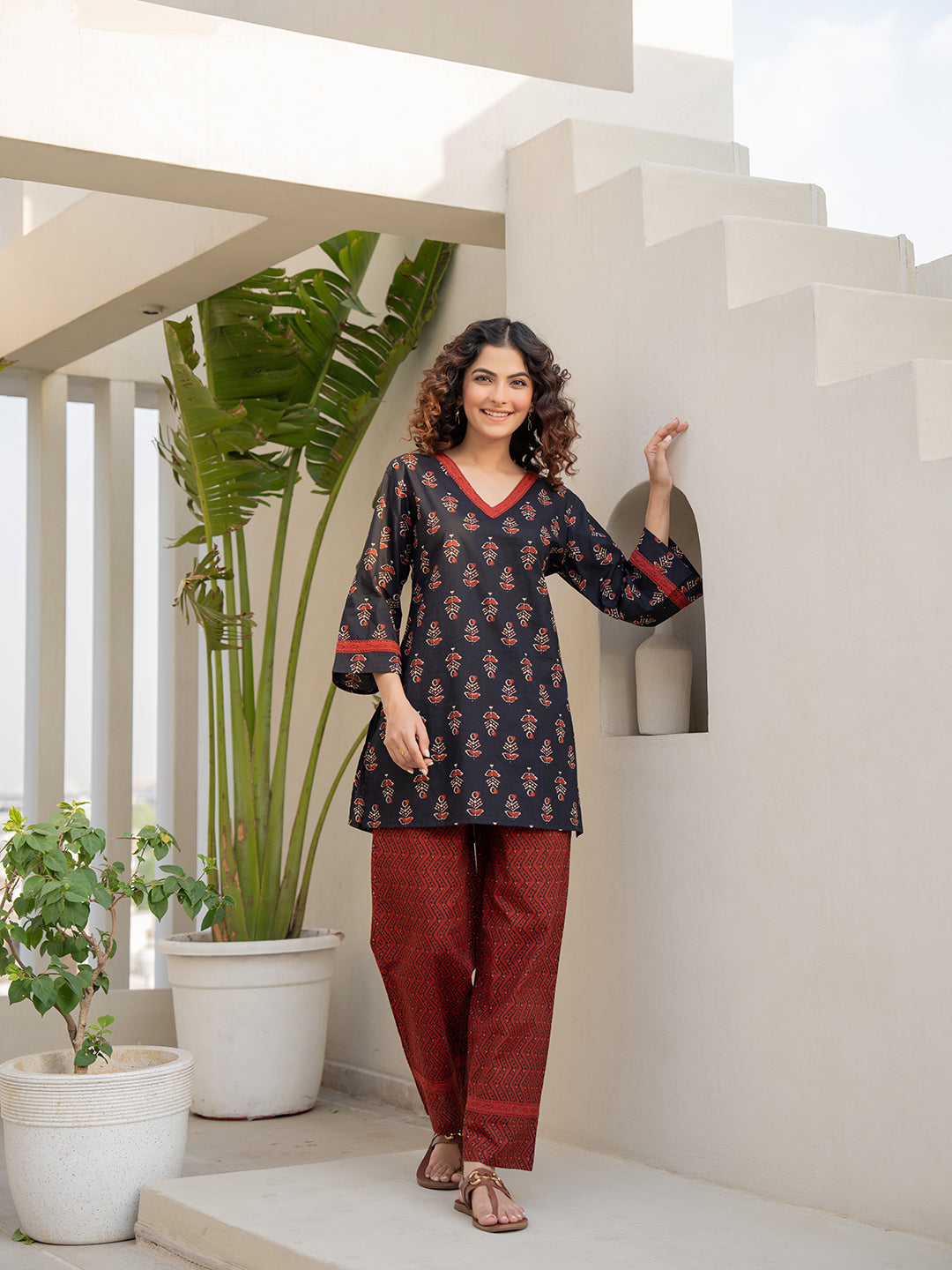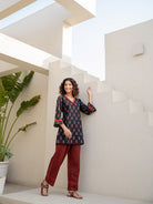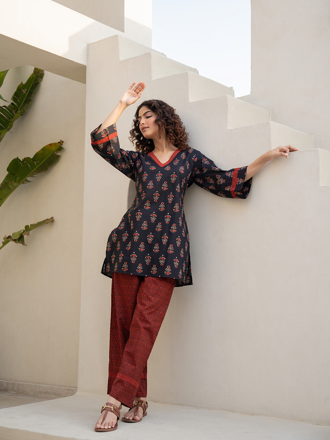 An ideal choice for your loungewear wardrobe, the Cotton Set comes in a soothing color palette. The hand block-printed pattern of the breezy Cotton top complements the matching Pants perfectly.