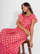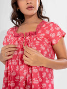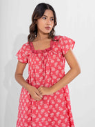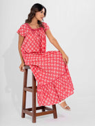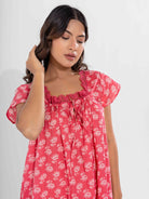 The Peach Muse Pure Cotton Tie-Up Square Neck Night Maxi blends playful charm with cozy comfort. Made from soft cotton, its tie-up detail and square neck add a fun, fresh vibe for relaxed nights.