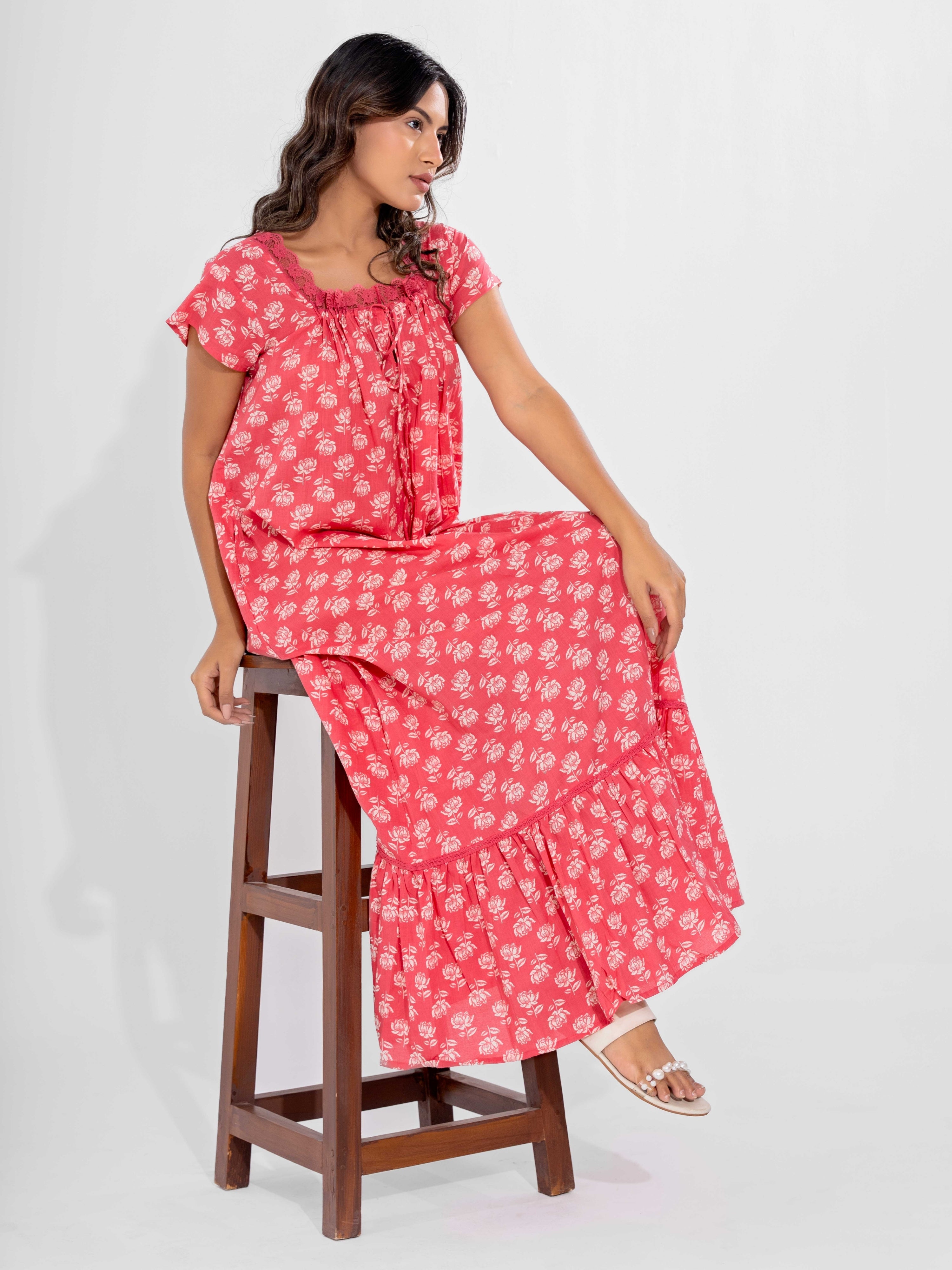 Peach Muse Pure Cotton Tie-Up Square Neck Night Maxi