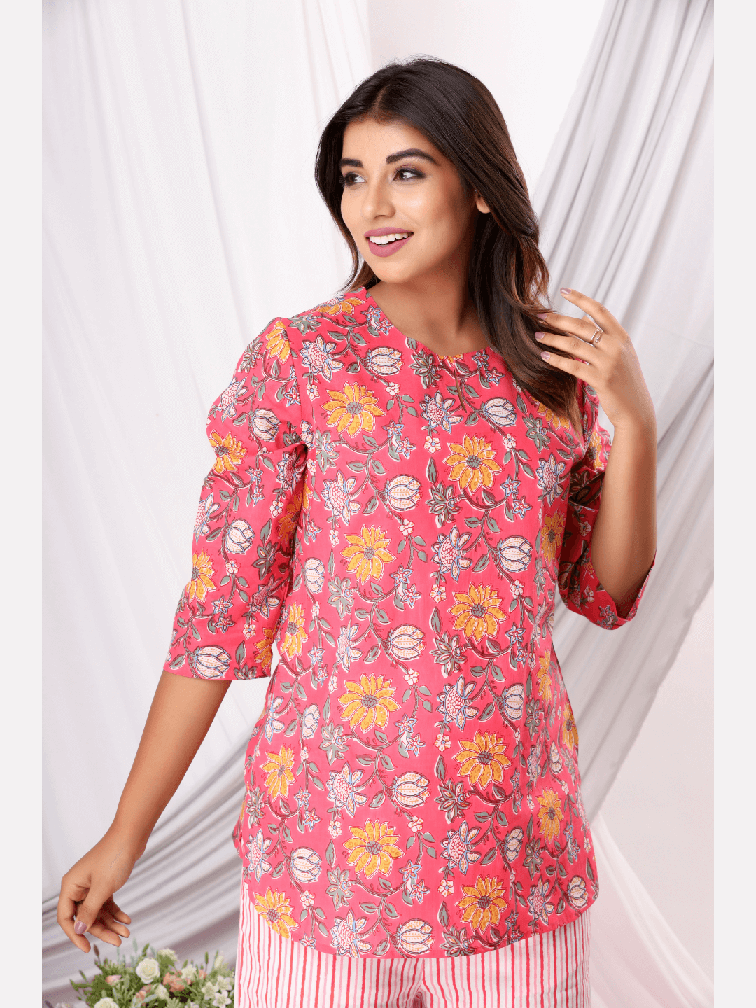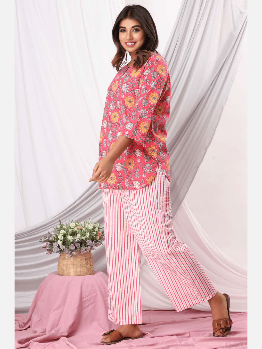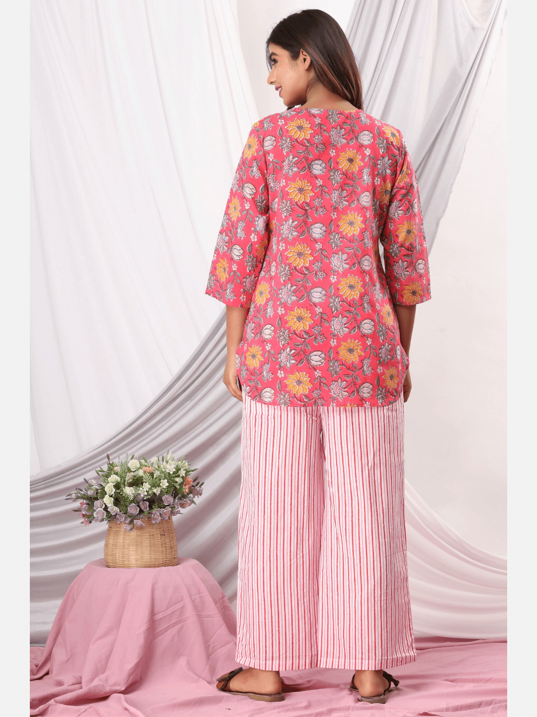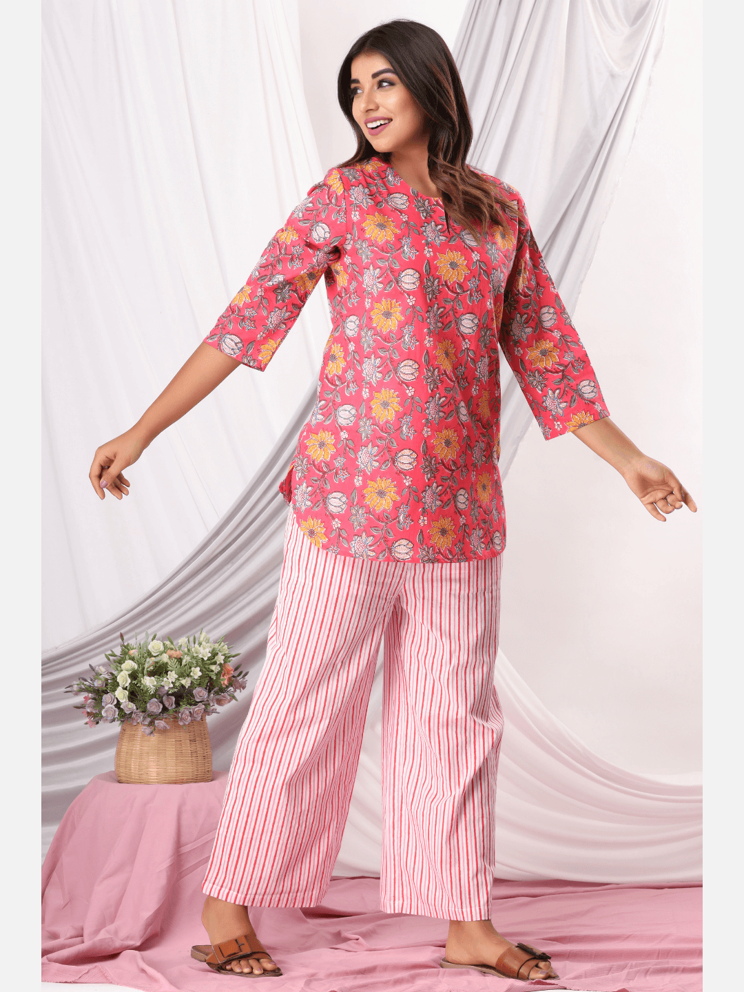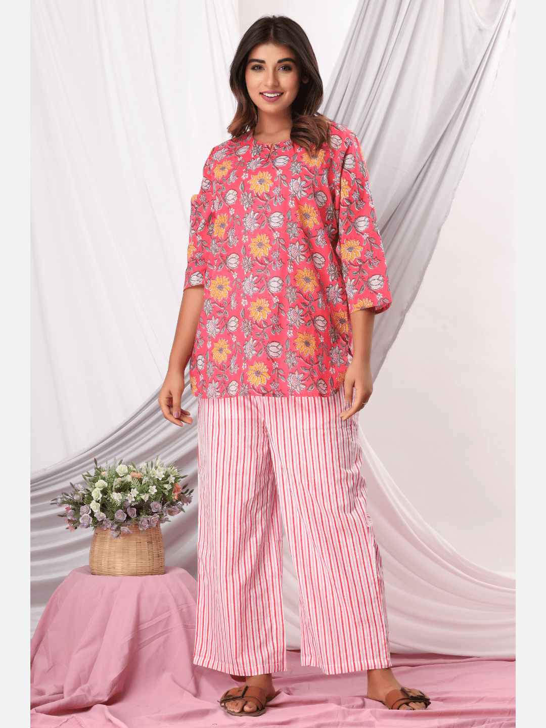 An ideal choice for your loungewear wardrobe, the Cotton Set comes in a soothing color palette. The hand block-printed pattern of the breezy Cotton top complements the matching Pants perfectly.