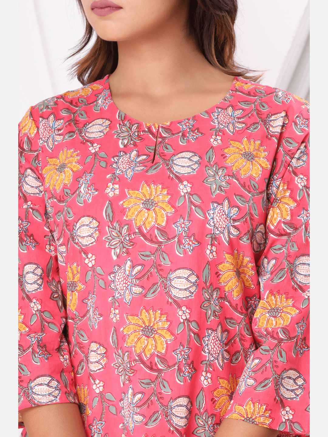 The company has done wonderful work by bringing nicely curated designs for night suits. The cost is also reasonable - but the quality of cotton can be increased.The cloth becomes somewhat transparent in sunlight/bright lights. The OVERALL DESIGNS and COMBINATION OF UPPER and LOWER PART OF DRESS is also great, therefore I hope, that company will take this feedback positively.