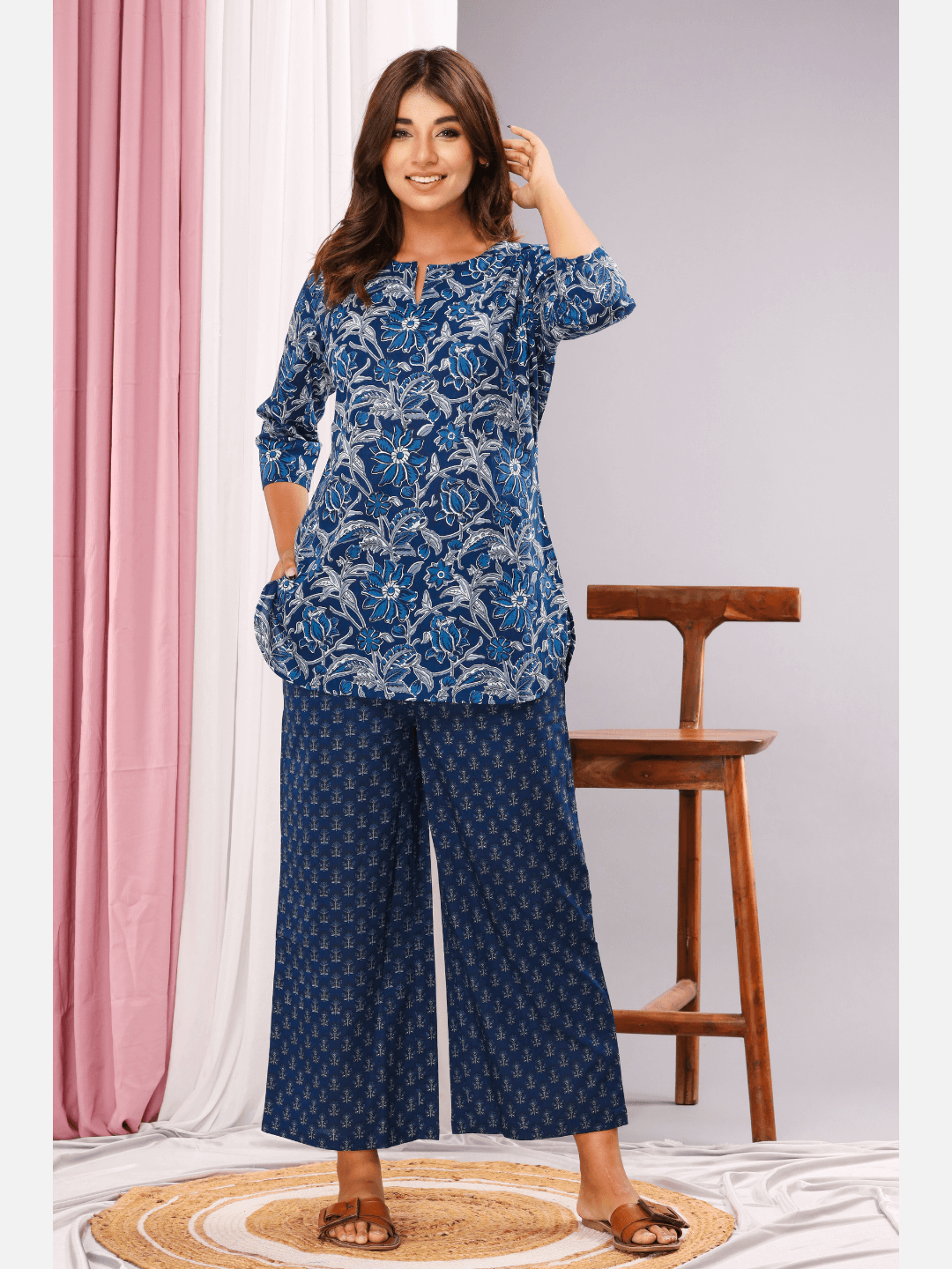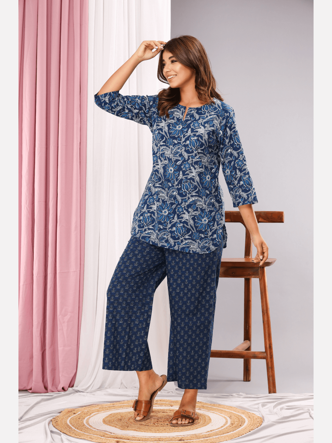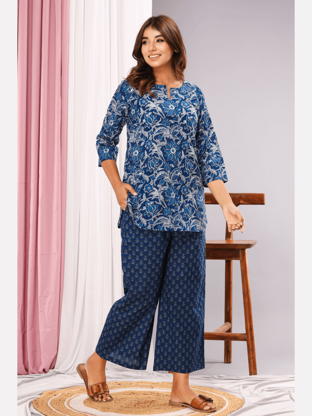 An ideal choice for your loungewear wardrobe, the Cotton Set comes in a soothing color palette. The hand block-printed pattern of the breezy Cotton top complements the matching Pants perfectly.