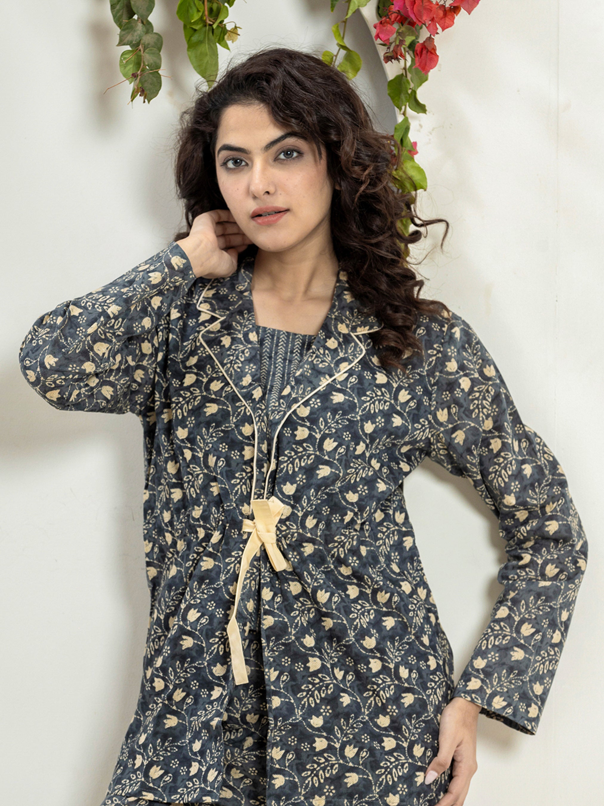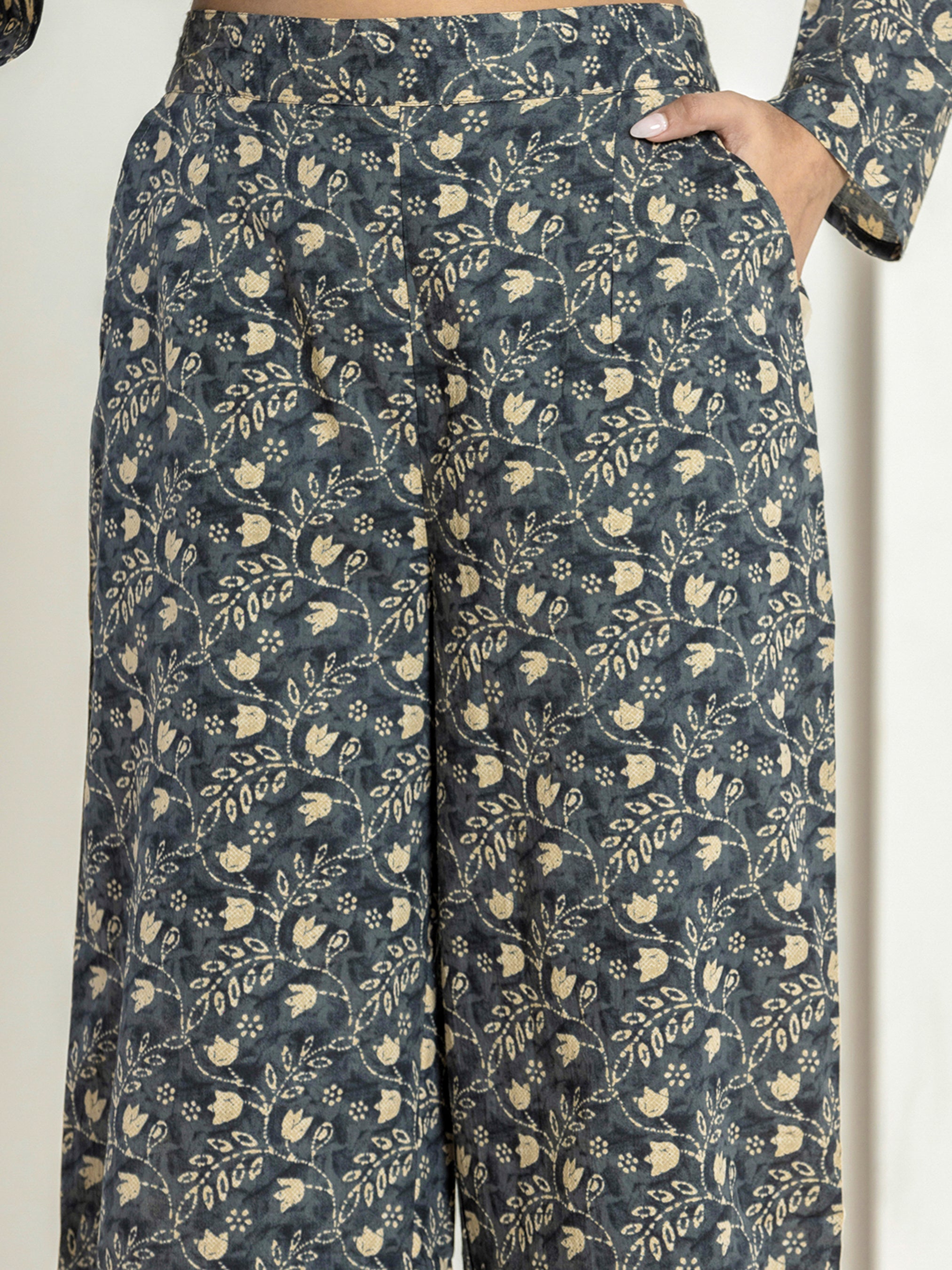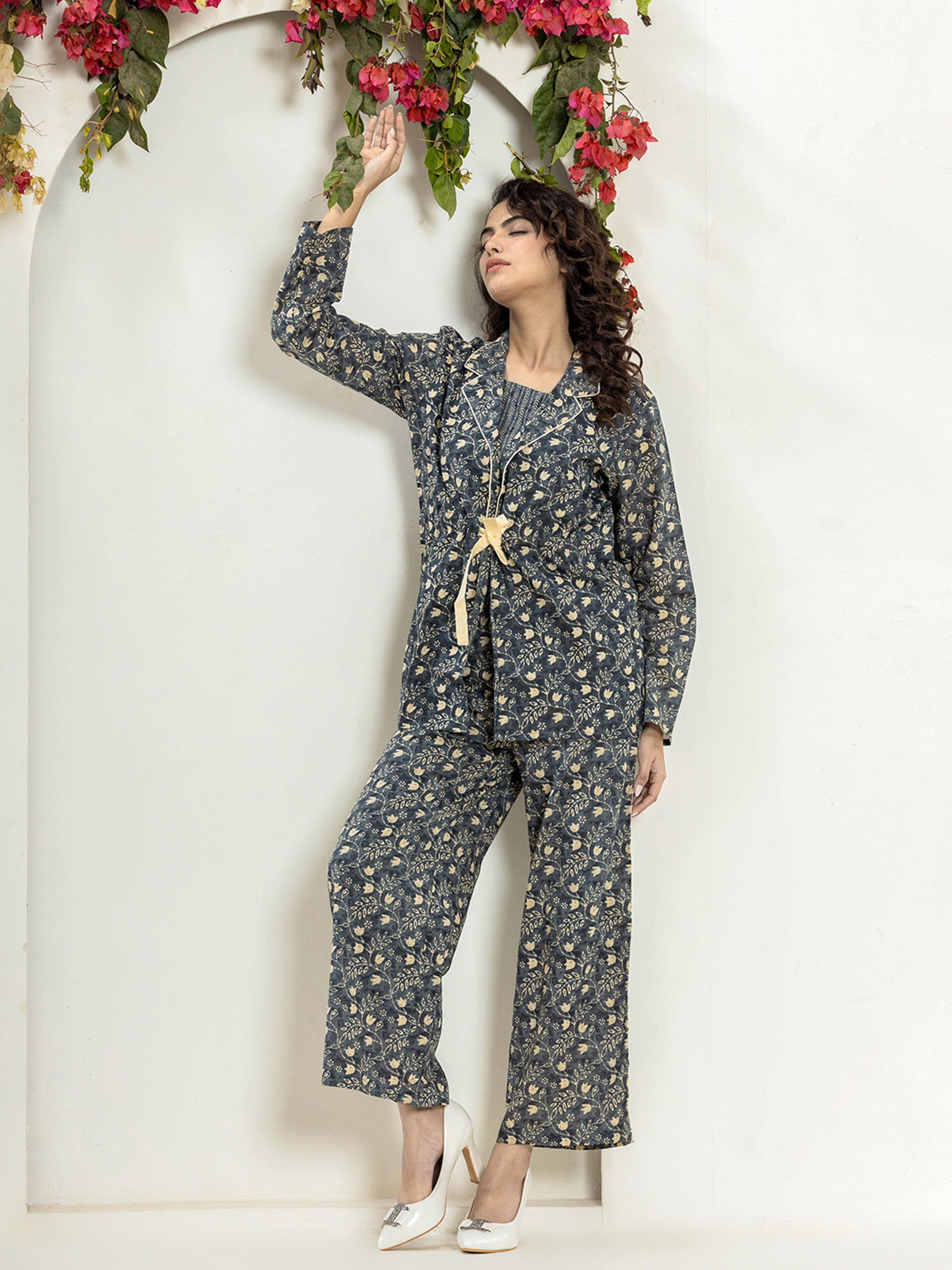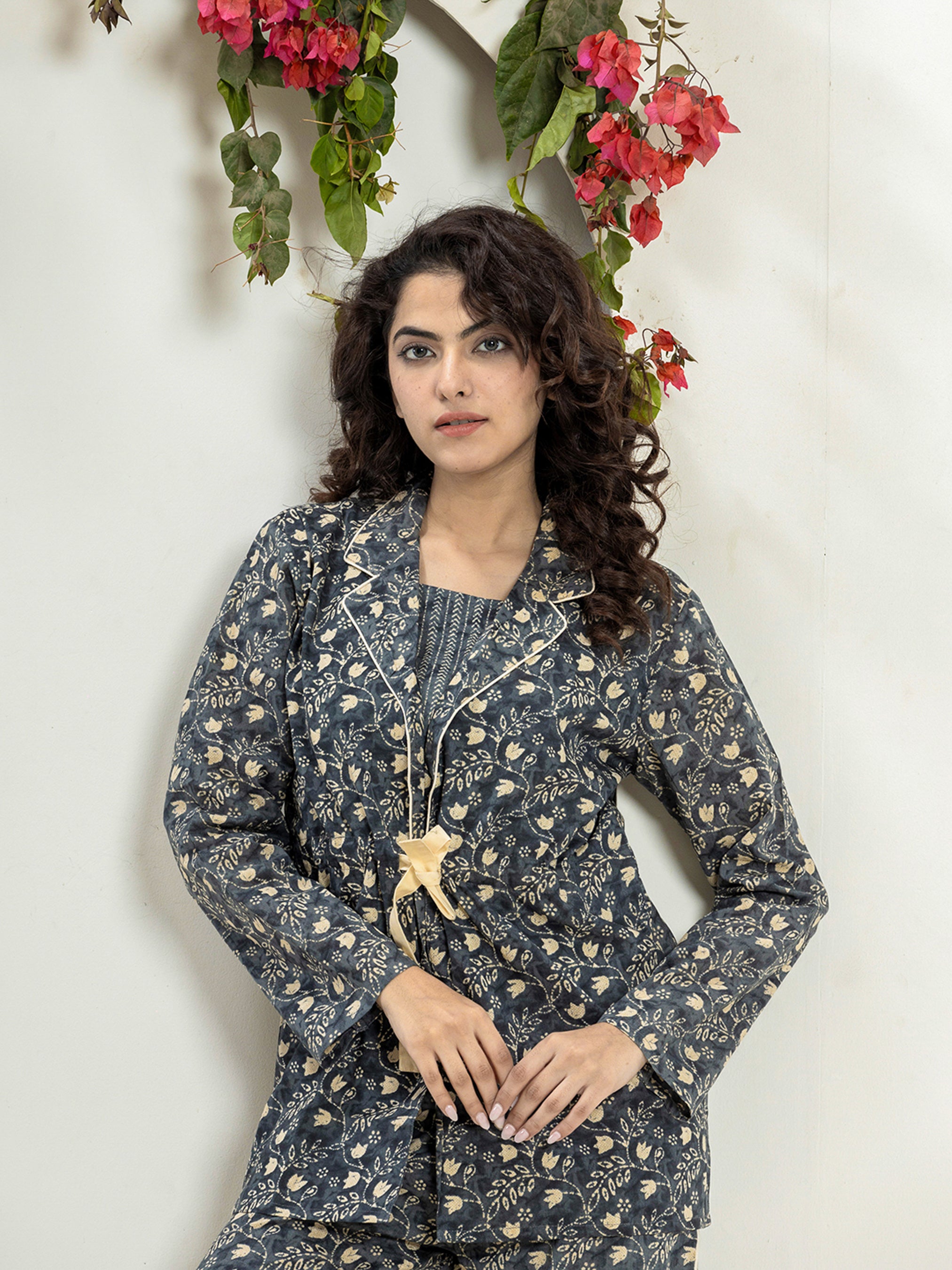 An ideal choice for your loungewear wardrobe, the Cotton Set comes in a soothing color palette. The hand-block-printed pattern of the breezy Cotton top complements the matching Pants perfectly.