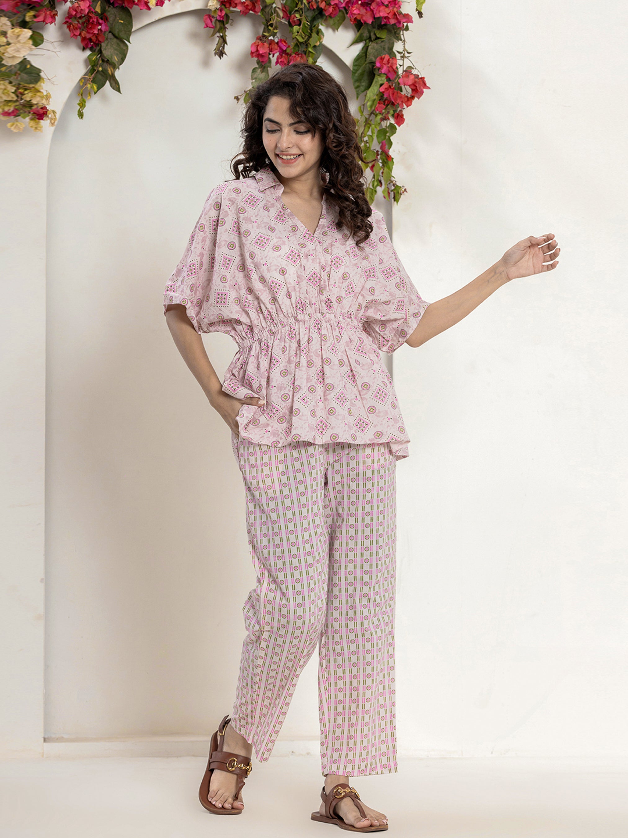 An ideal choice for your loungewear wardrobe, the Cotton Set comes in a soothing color palette. The hand-block-printed pattern of the breezy Cotton top complements the matching Pants perfectly.
