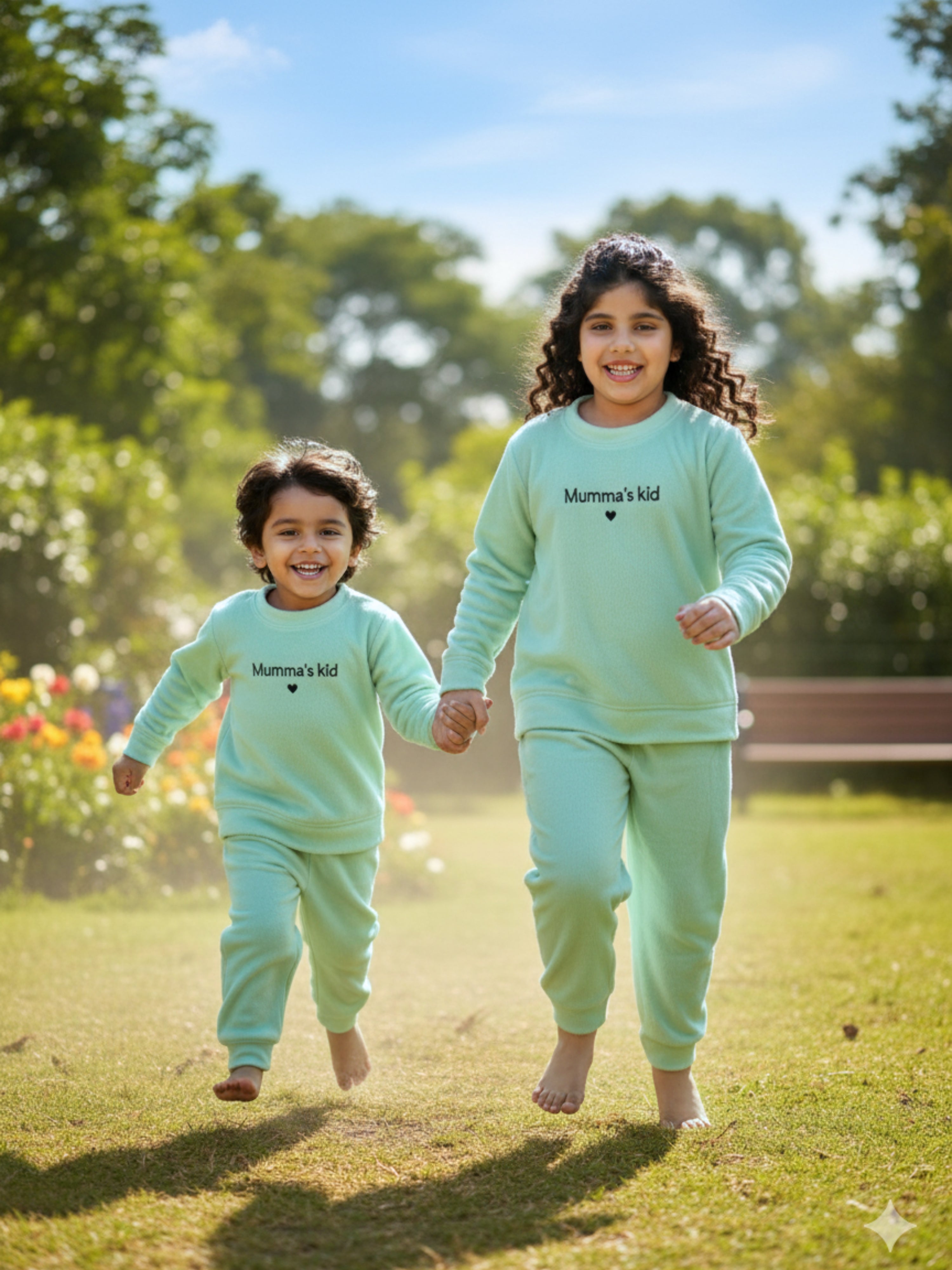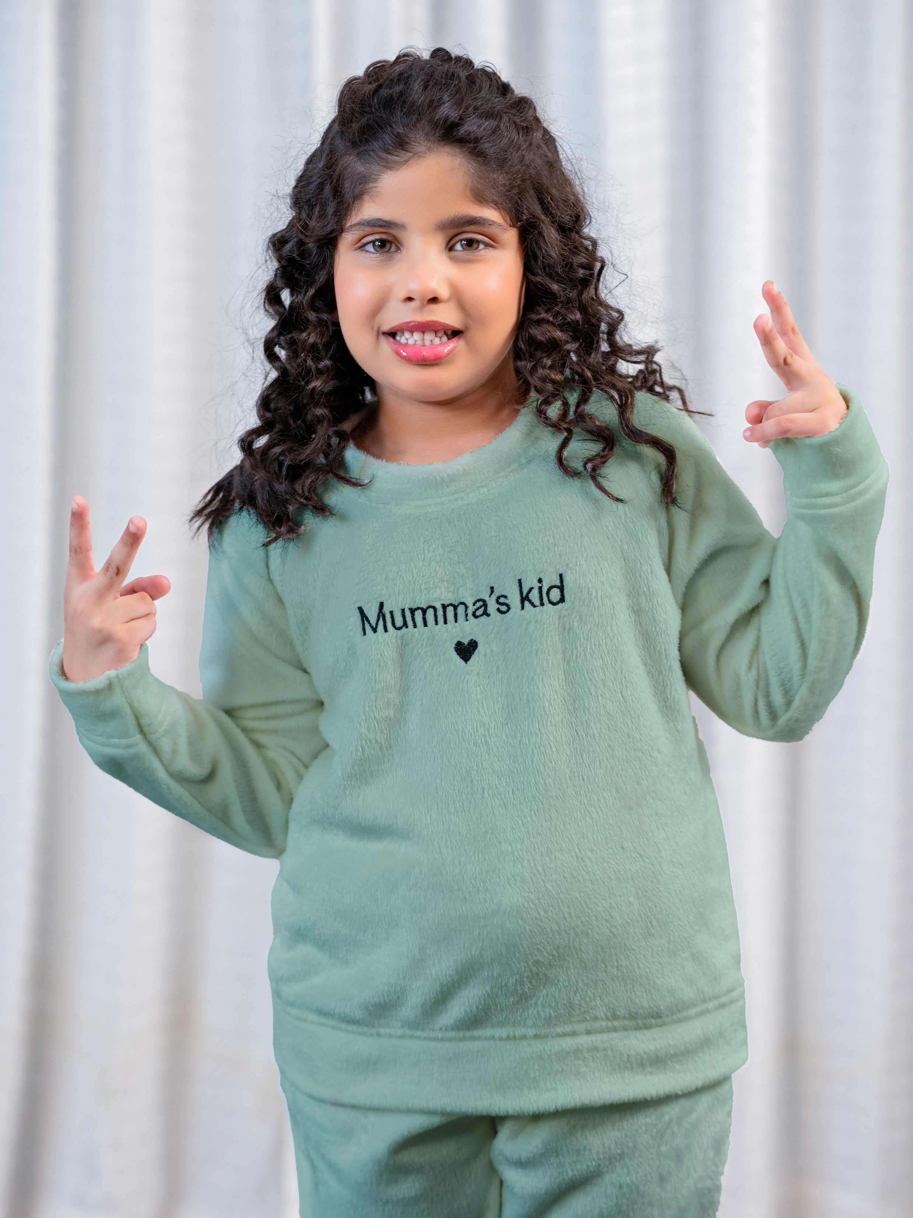 Snuggle up in sea green softness! This unisex woollen sweatshirt set features adorable "Mumma's Kid" embroidery. Super cozy and perfect for playtime or lazy days, it's the hug your little one deserves!