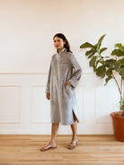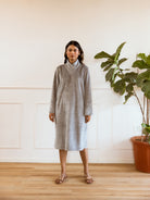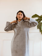 Introducing the perfect dress for cozy, stylish winter days - our Super Soft Grey Woollen Cross Neck Midi Dress! Crafted from luxurious, soft wool, this dress features a unique cross neck design for a touch of elegance. Stay warm, chic, and comfy all season long.