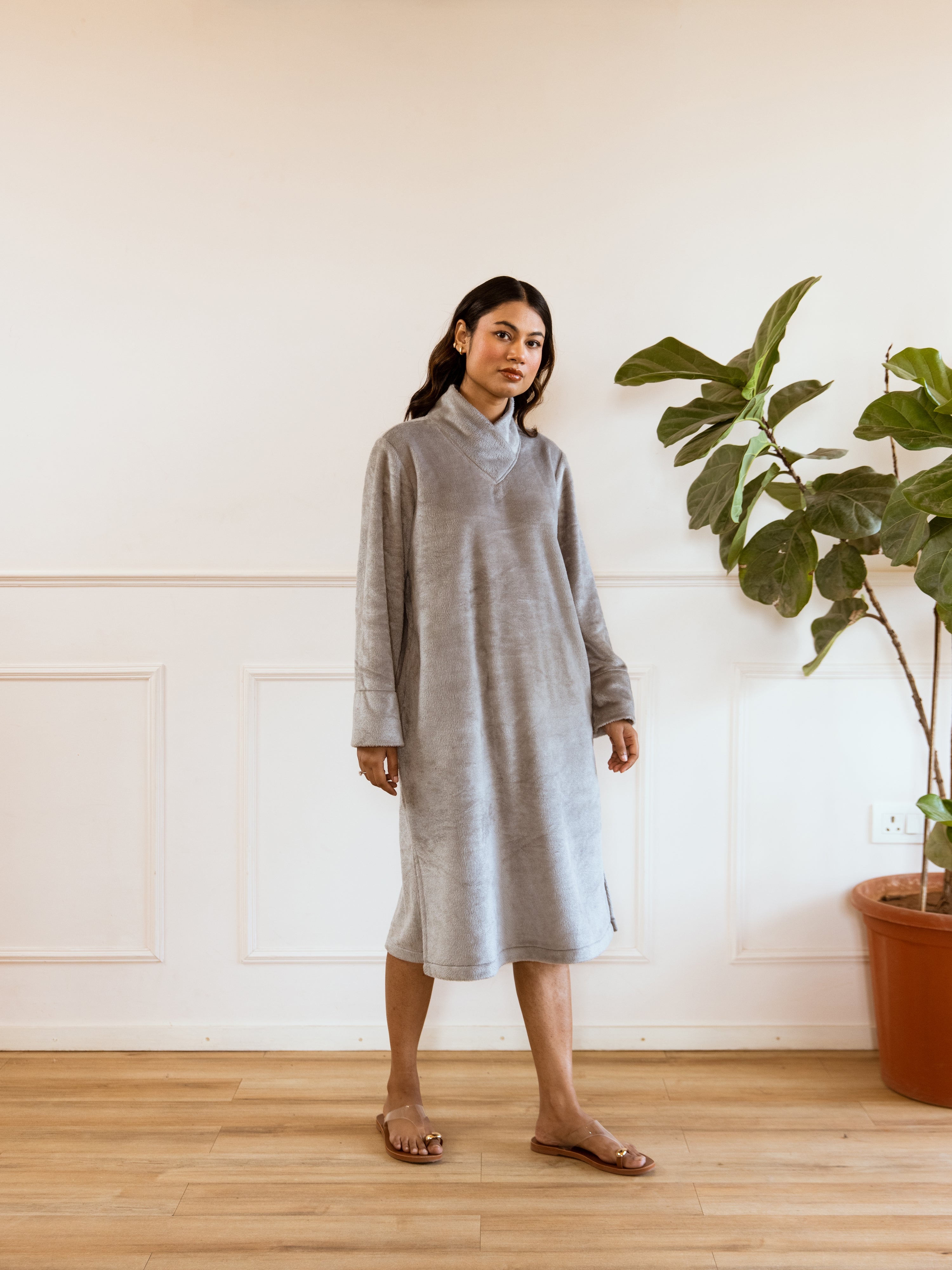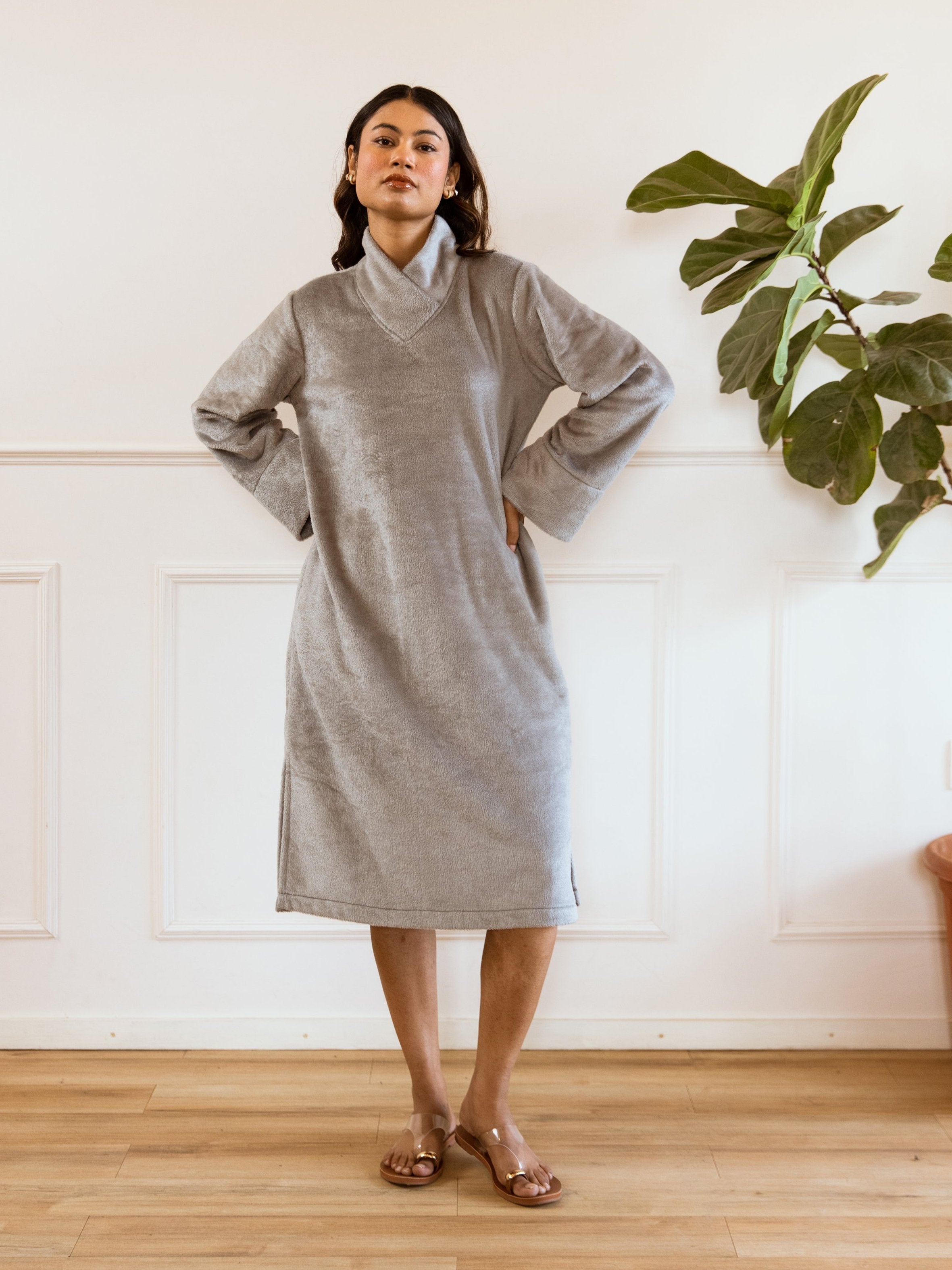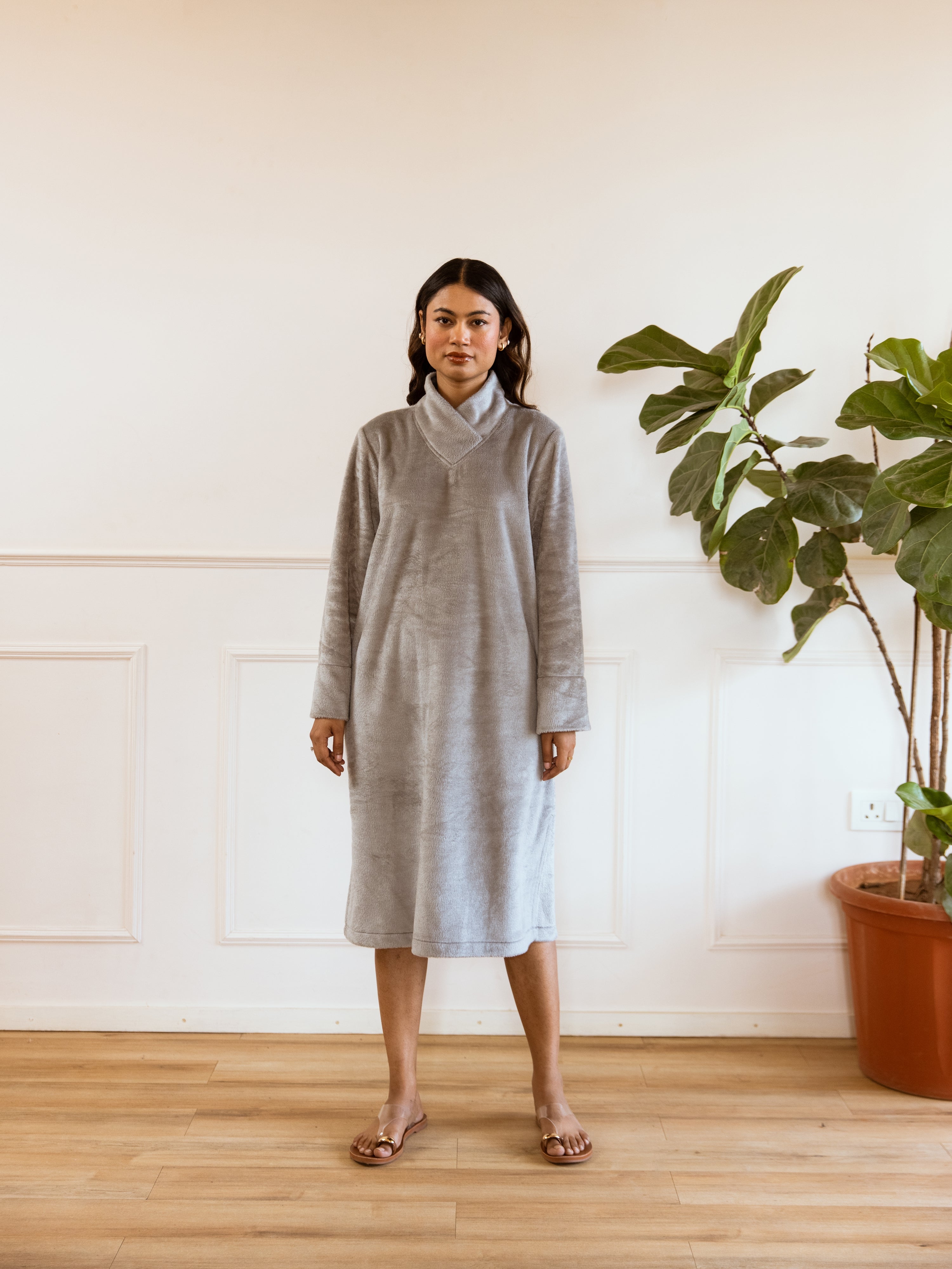 Super Soft Grey Woollen Cross Neck Midi Dress