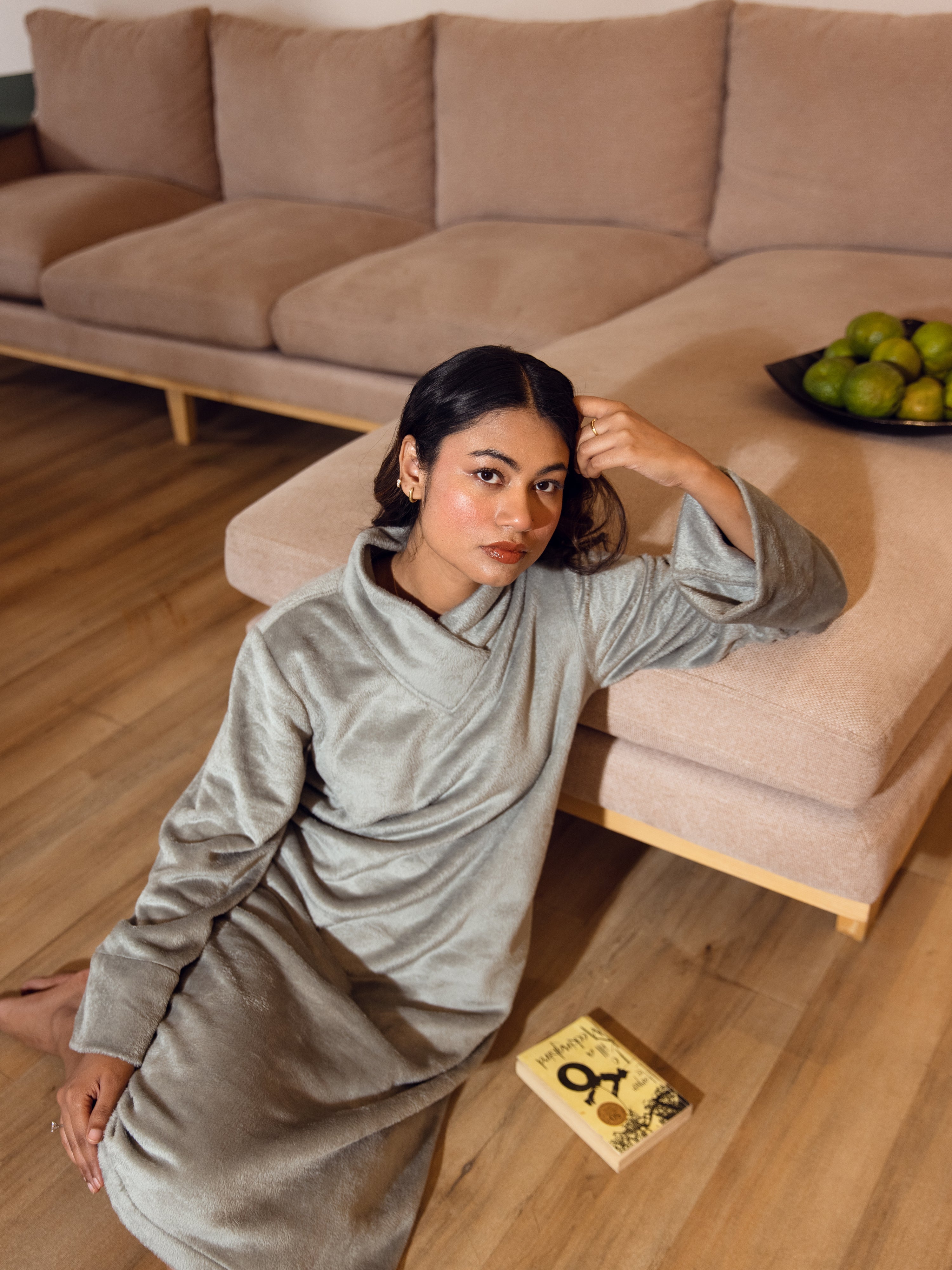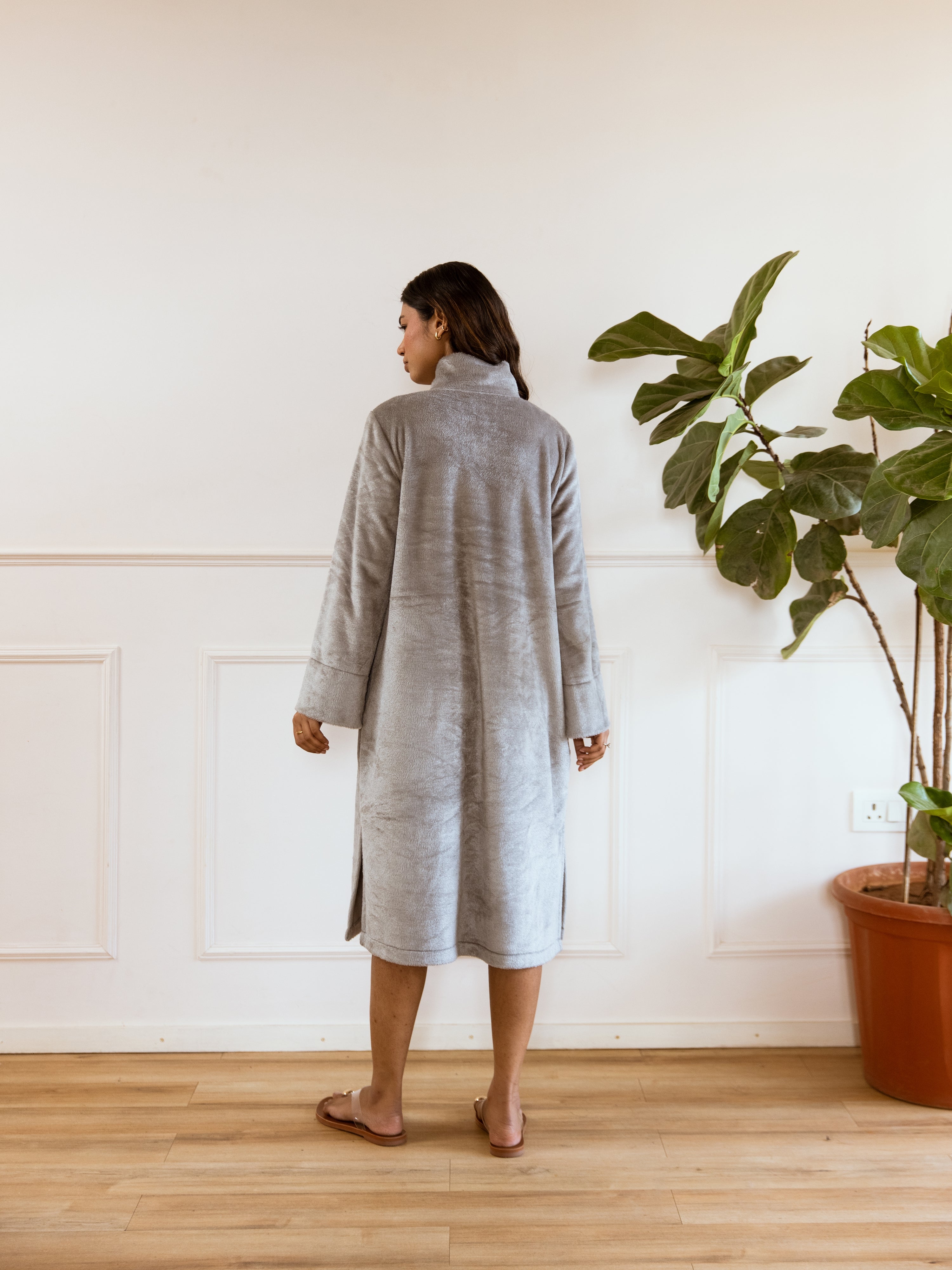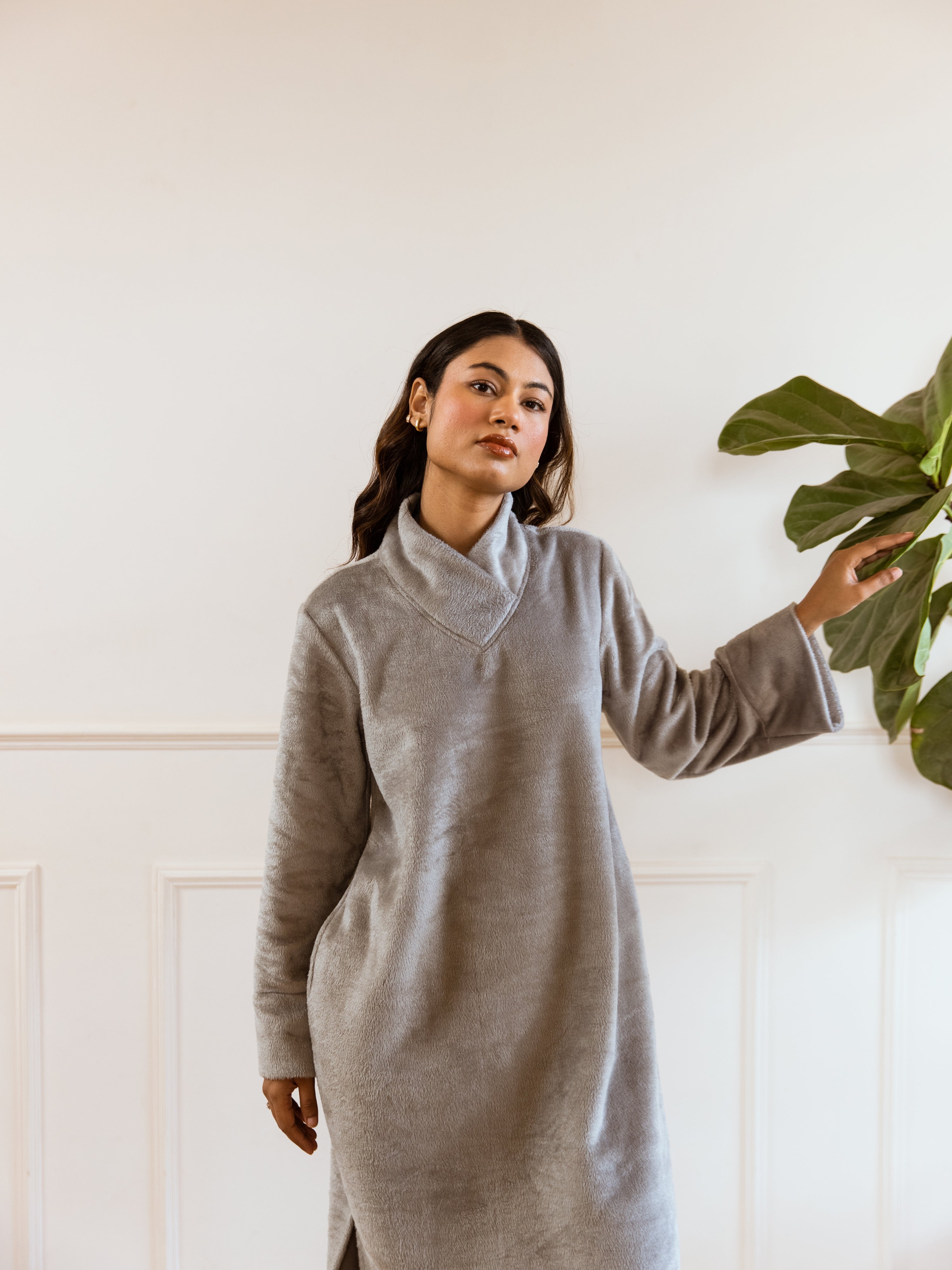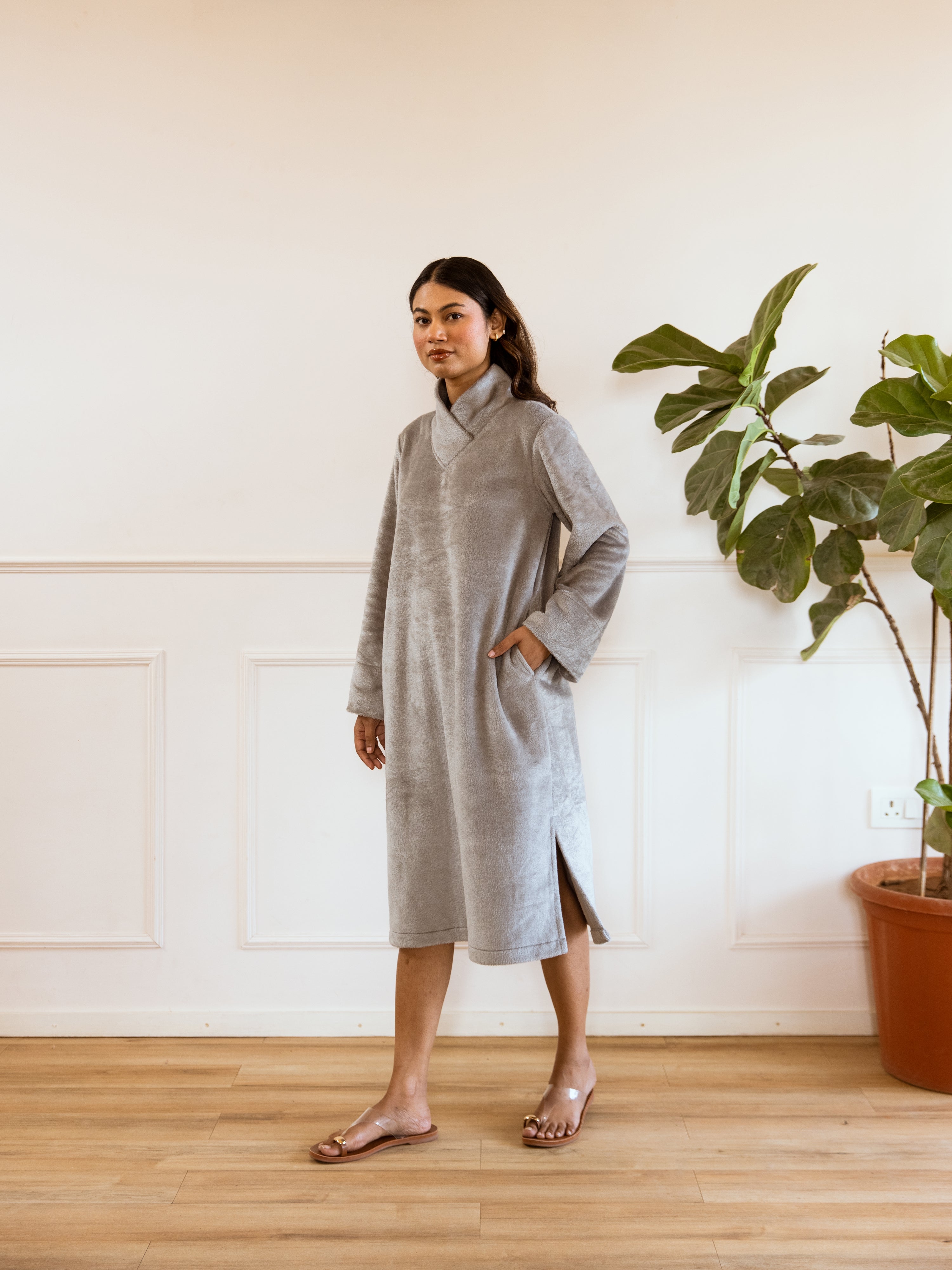 Super Soft Grey Woollen Cross Neck Midi Dress