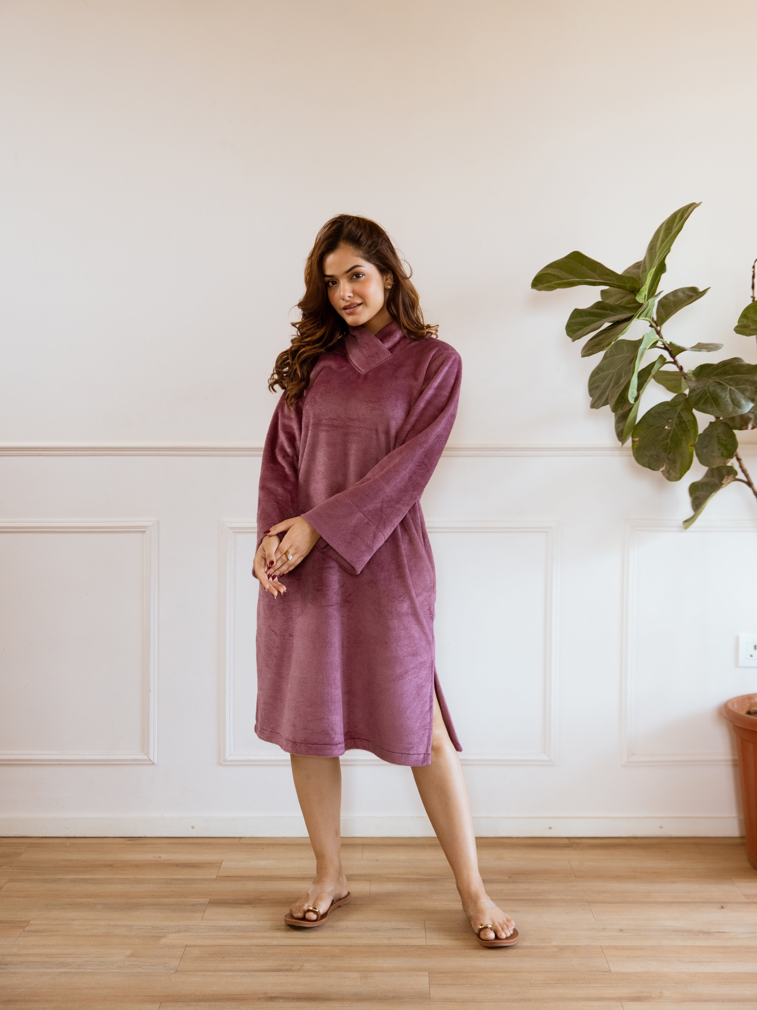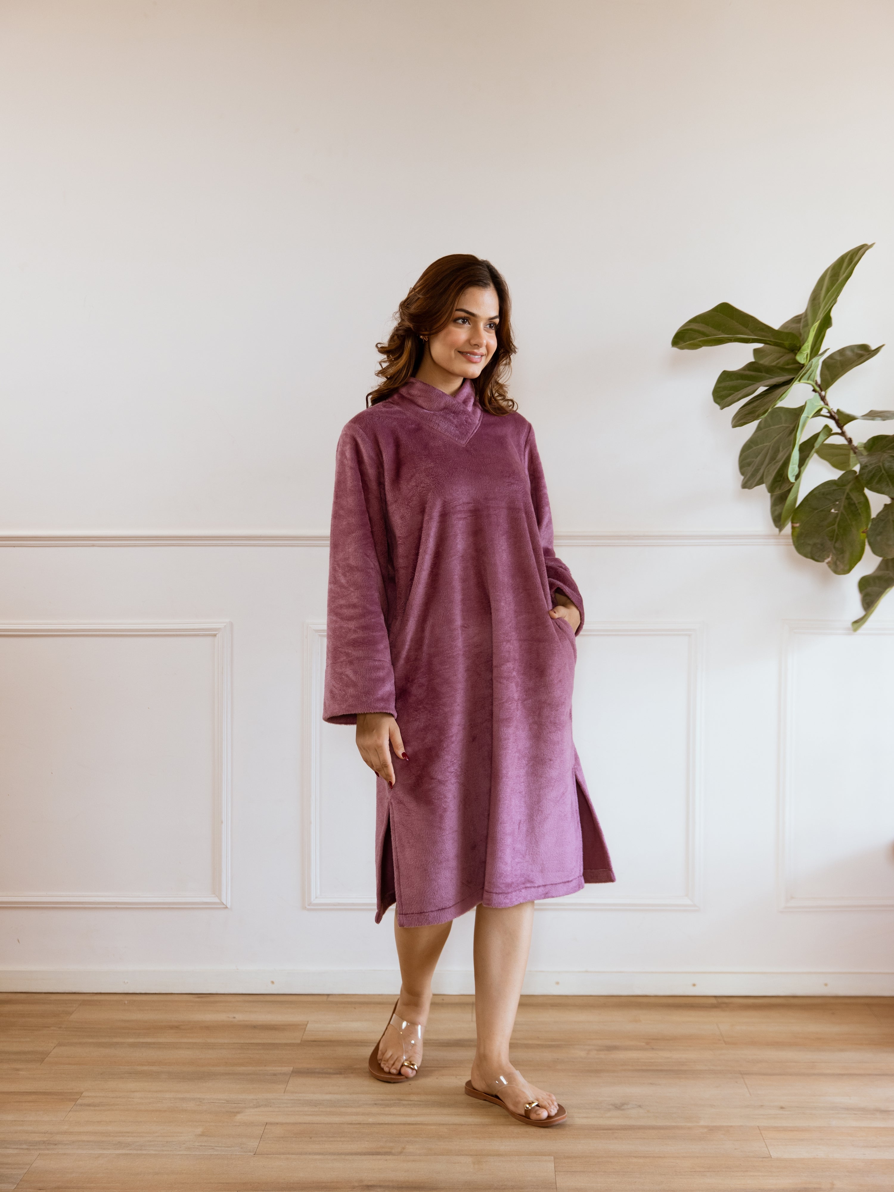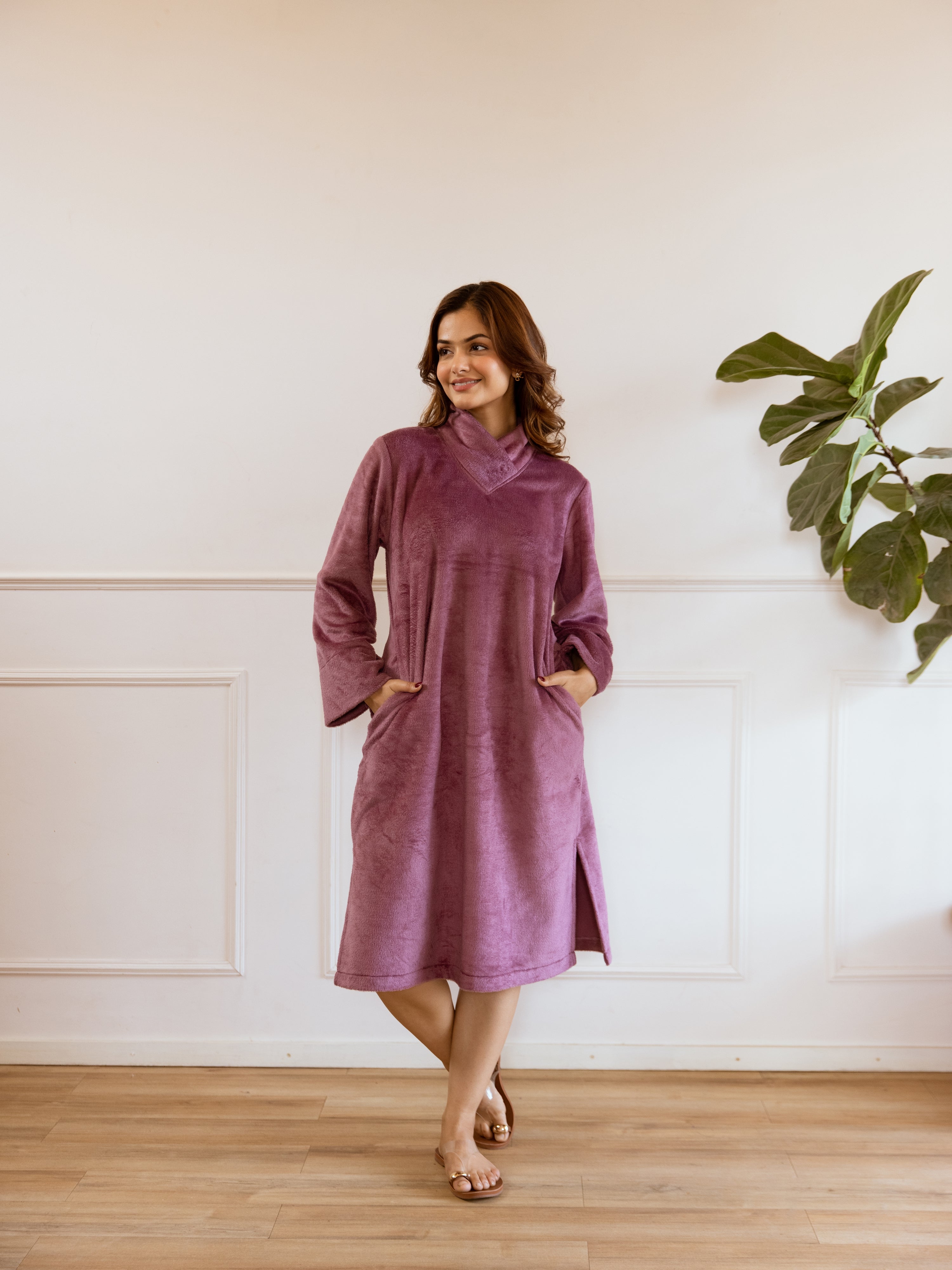 Super Soft Purple Woollen Cross Neck Midi Dress