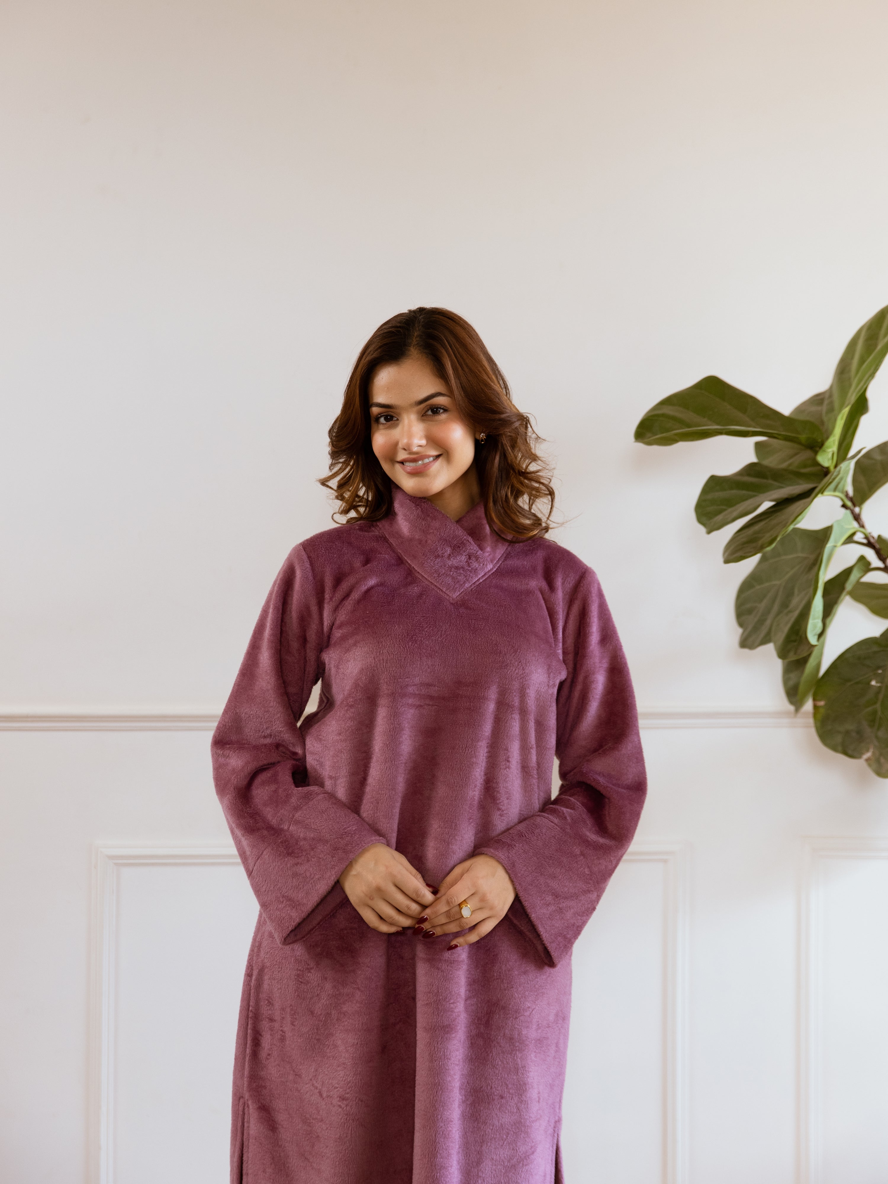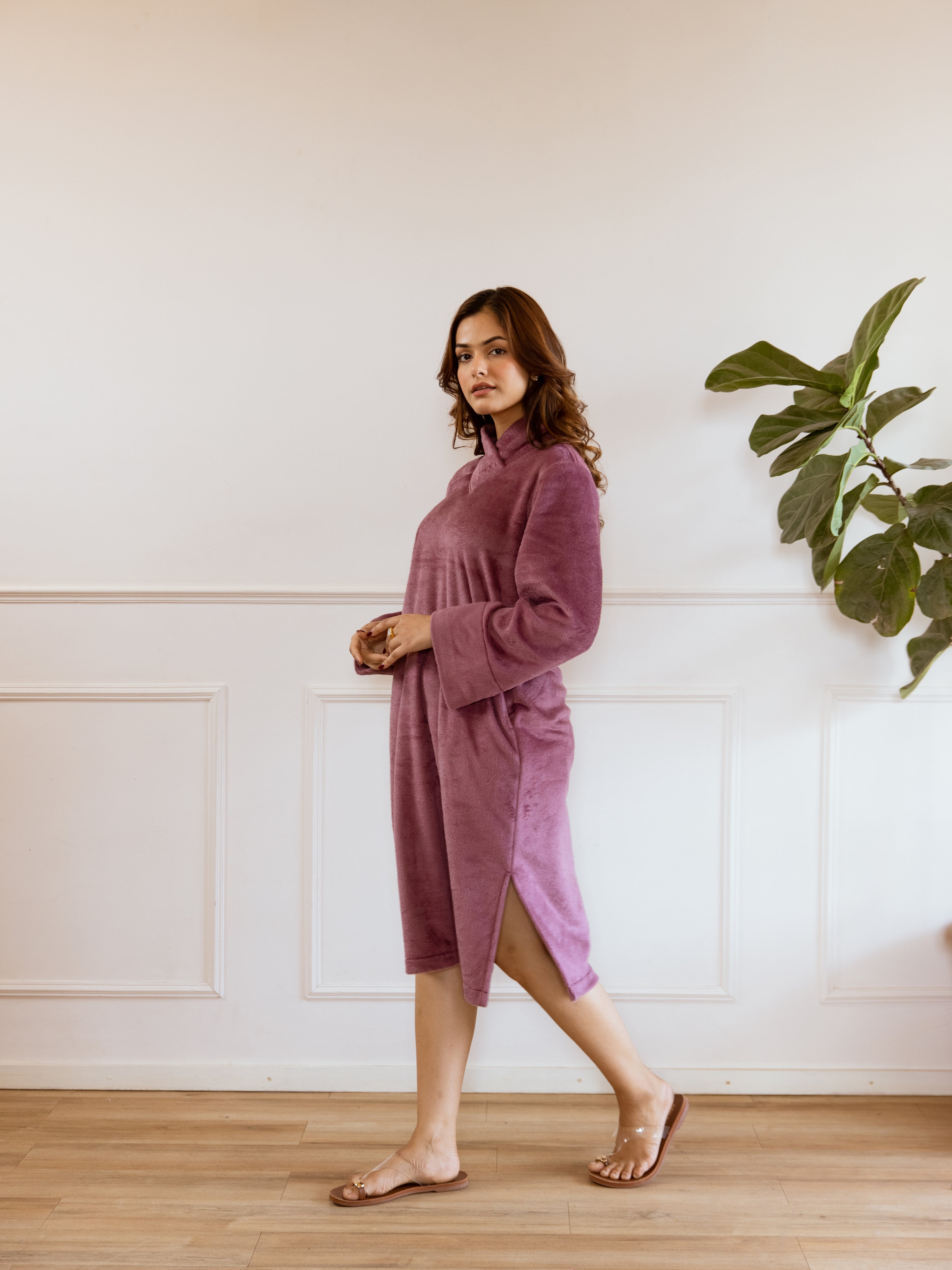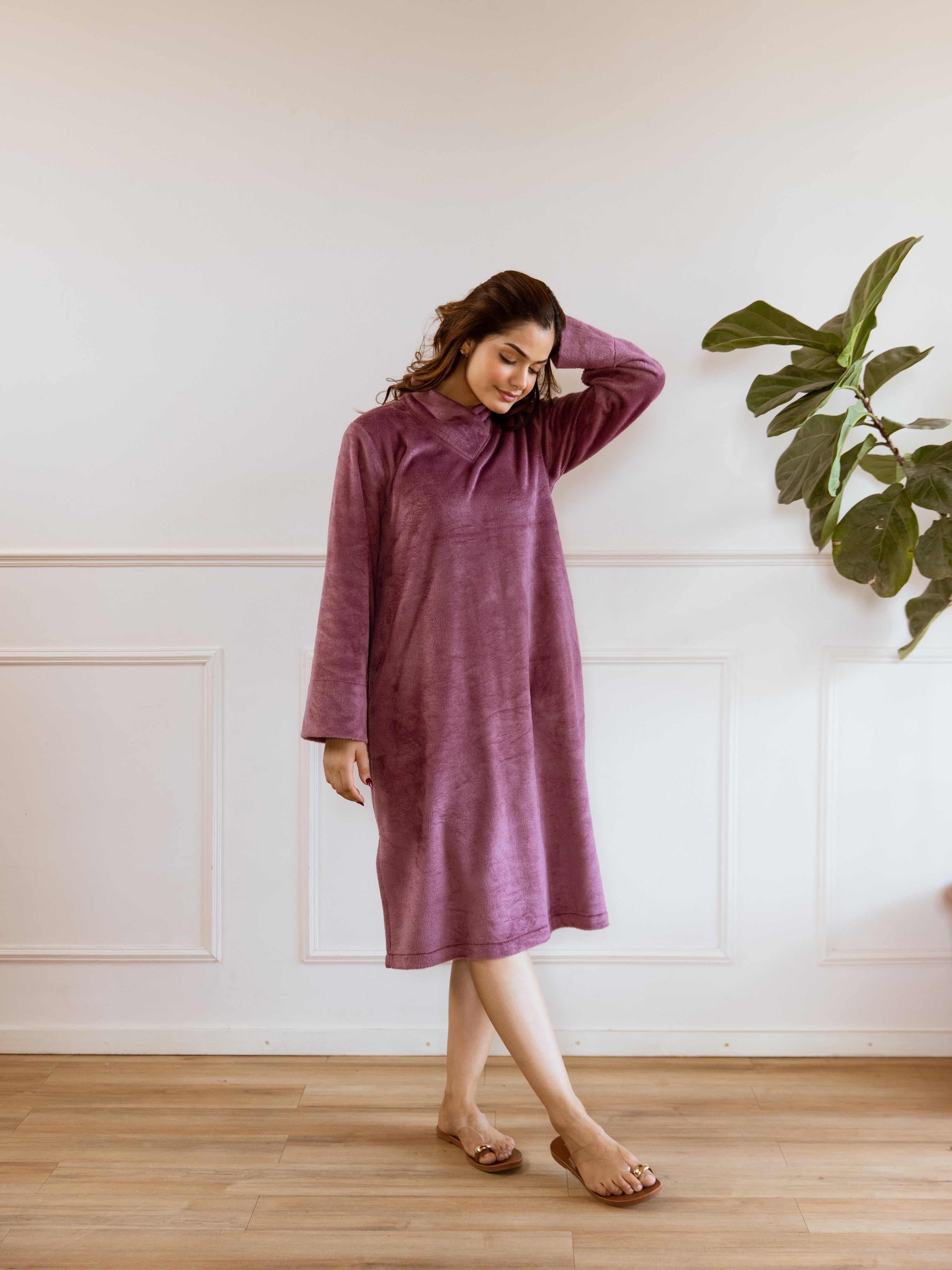 Super Soft Purple Woollen Cross Neck Midi Dress