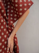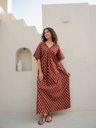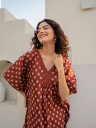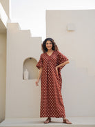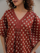 Uplift your fashion sense by getting them this comfy Hand Block Printed Cotton Kaftan. It features an all-over hand block print, a V neckline, elbow-length sleeves, and Lace detailing.
