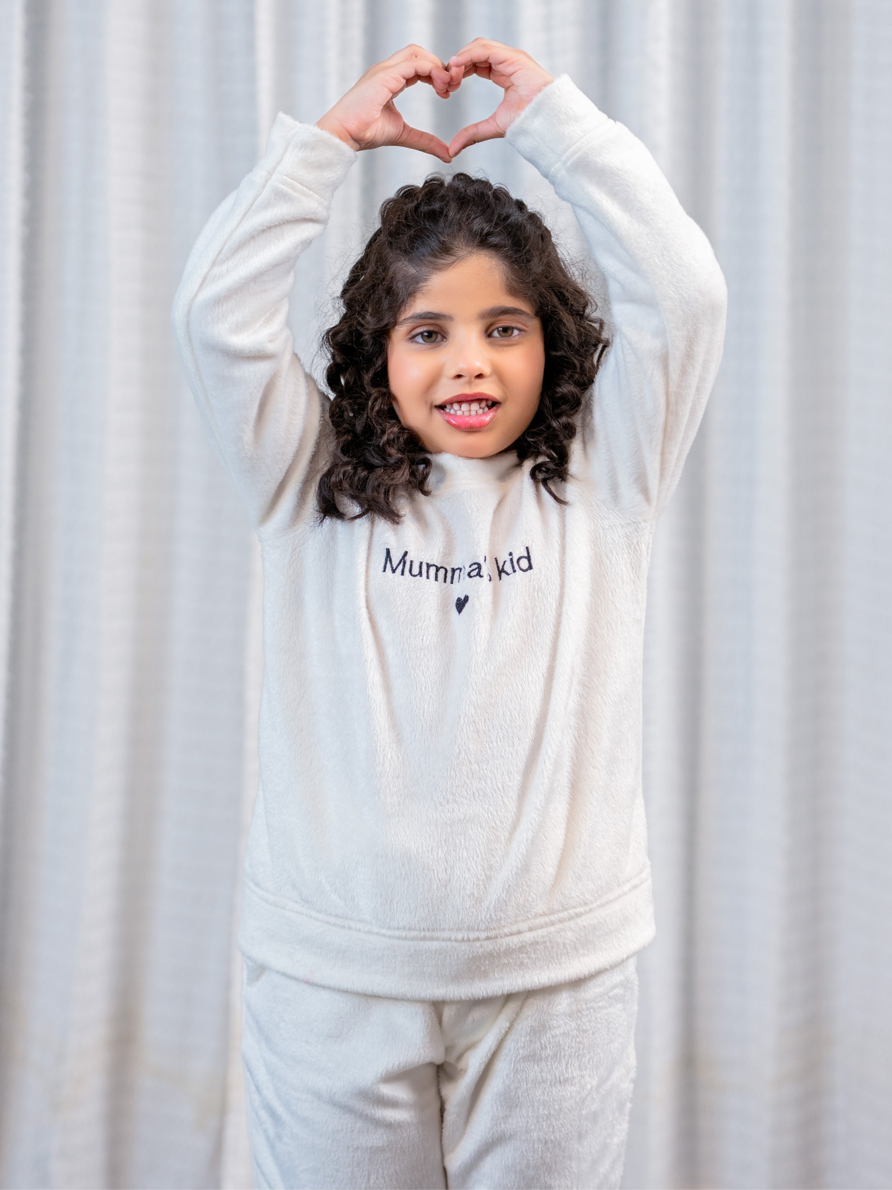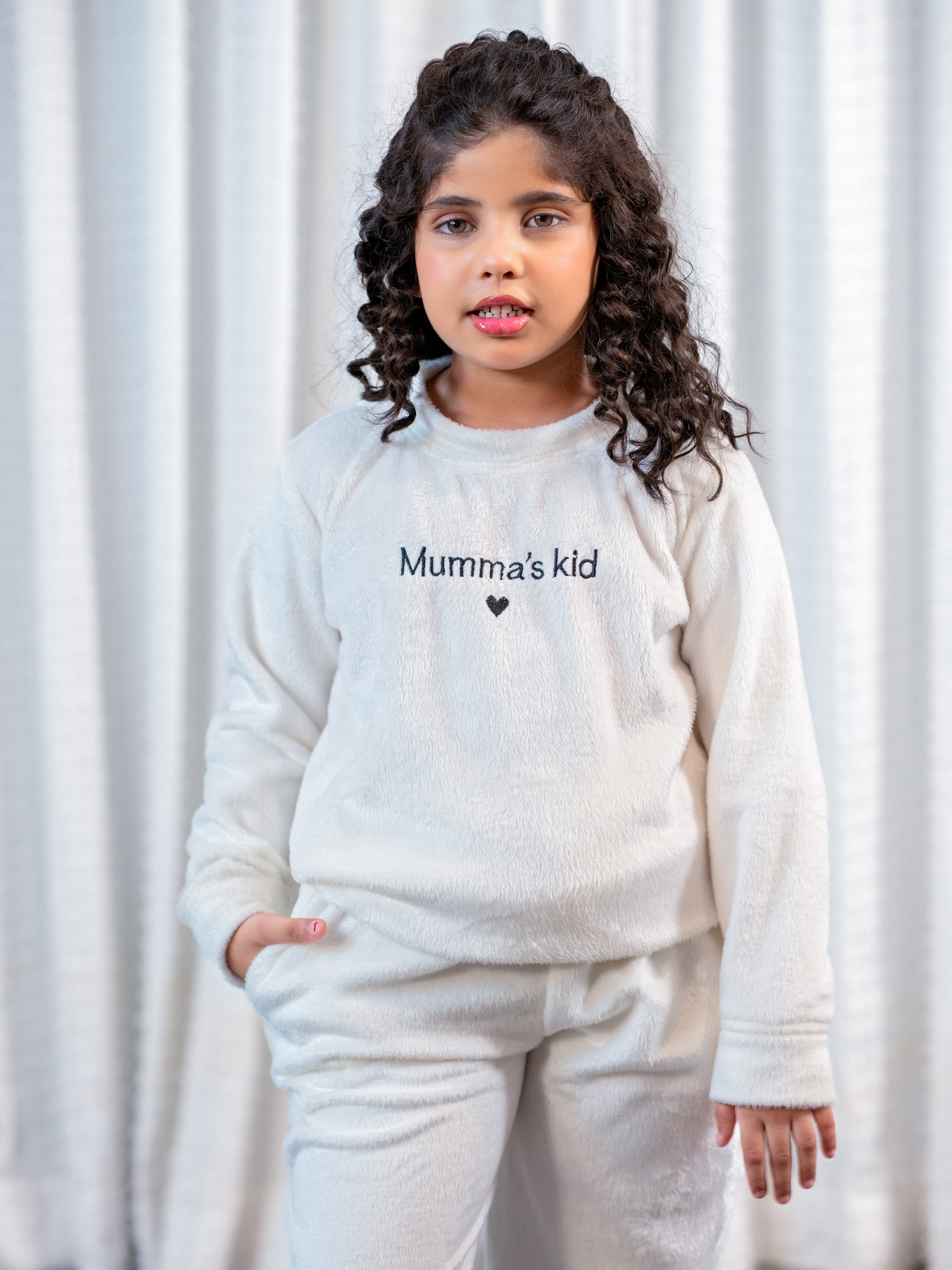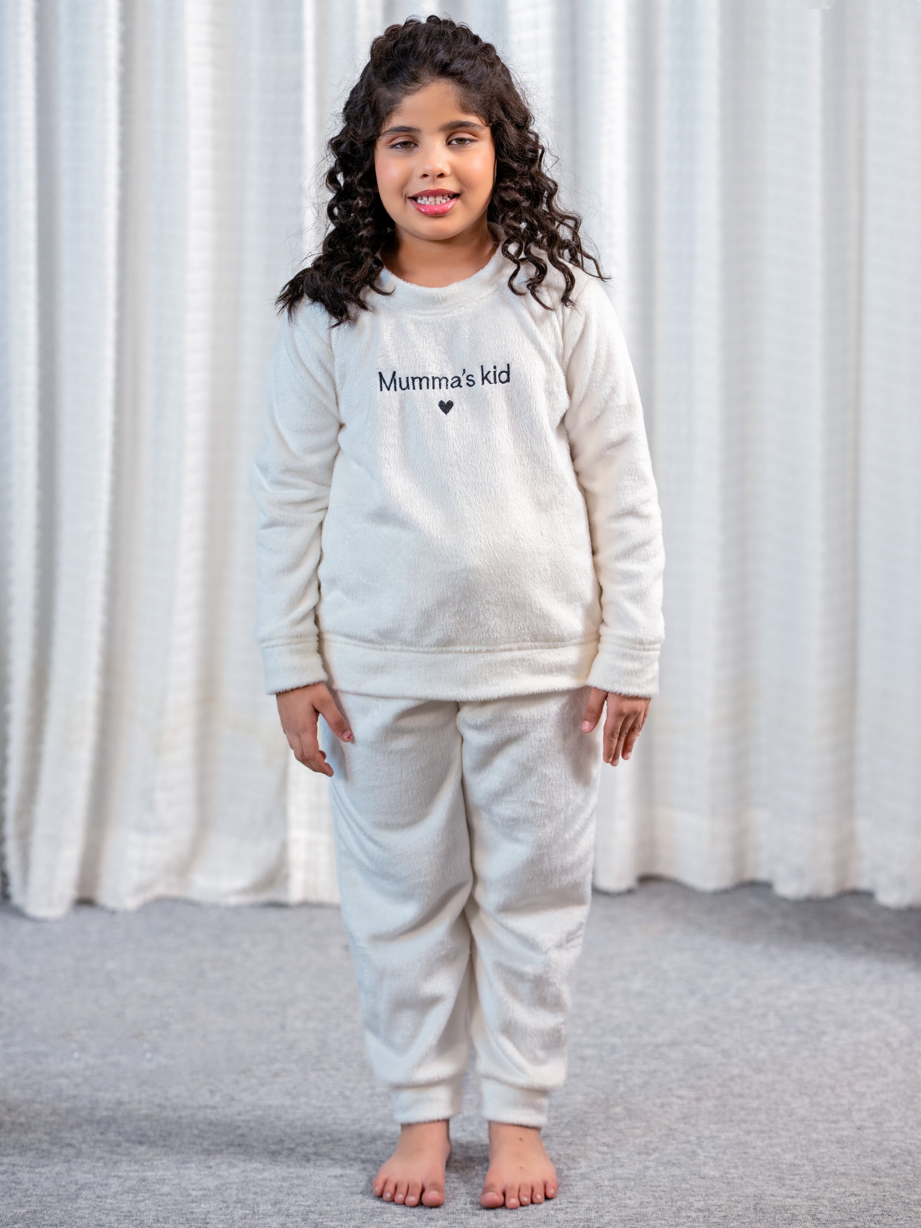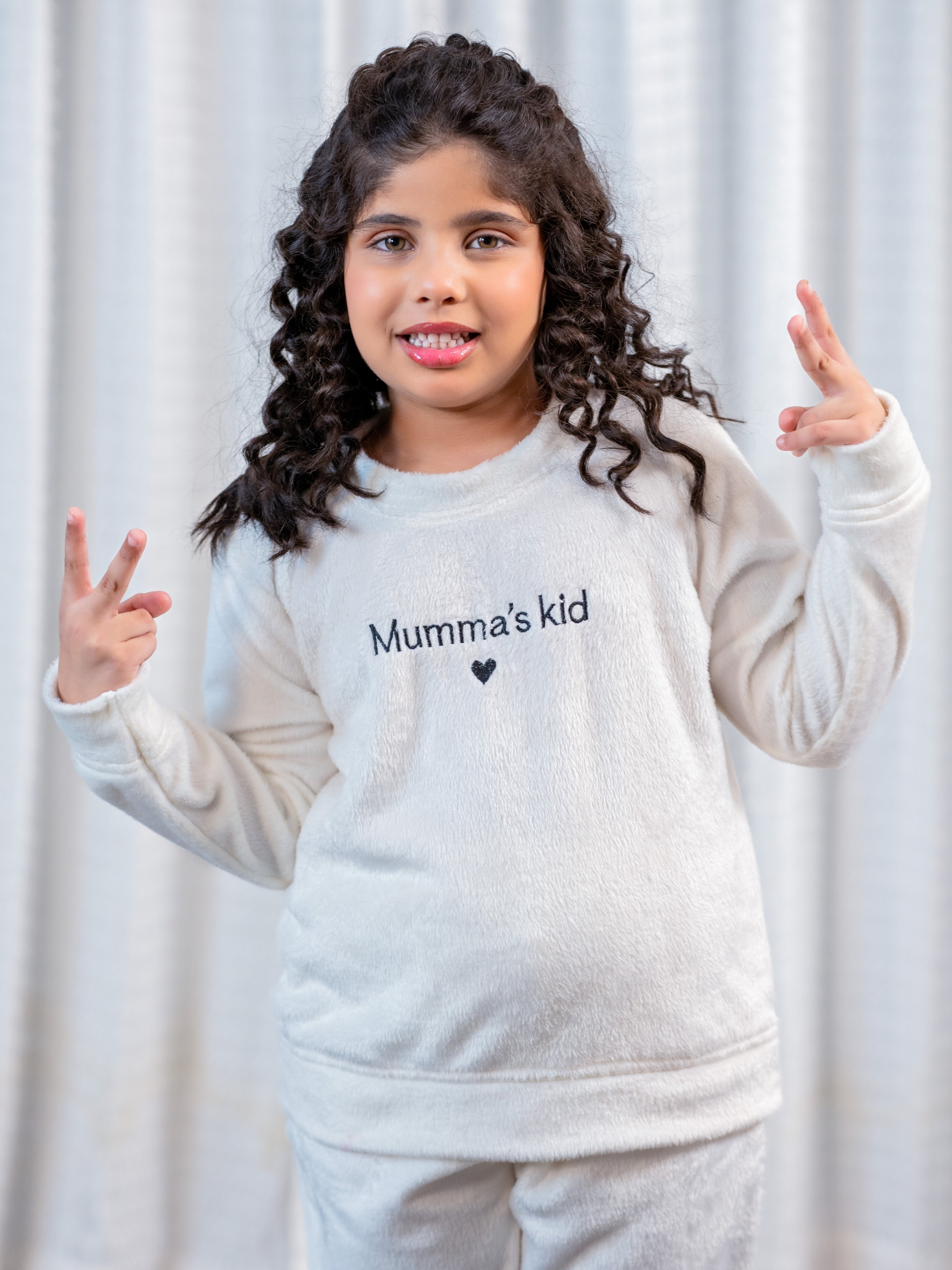 Show your love with this adorable white woollen sweatshirt featuring "mumma kids" embroidery! Plush-soft and perfect for snuggles, it's a sweet way to celebrate your special bond. Unisex comfort that every child will adore wearing.