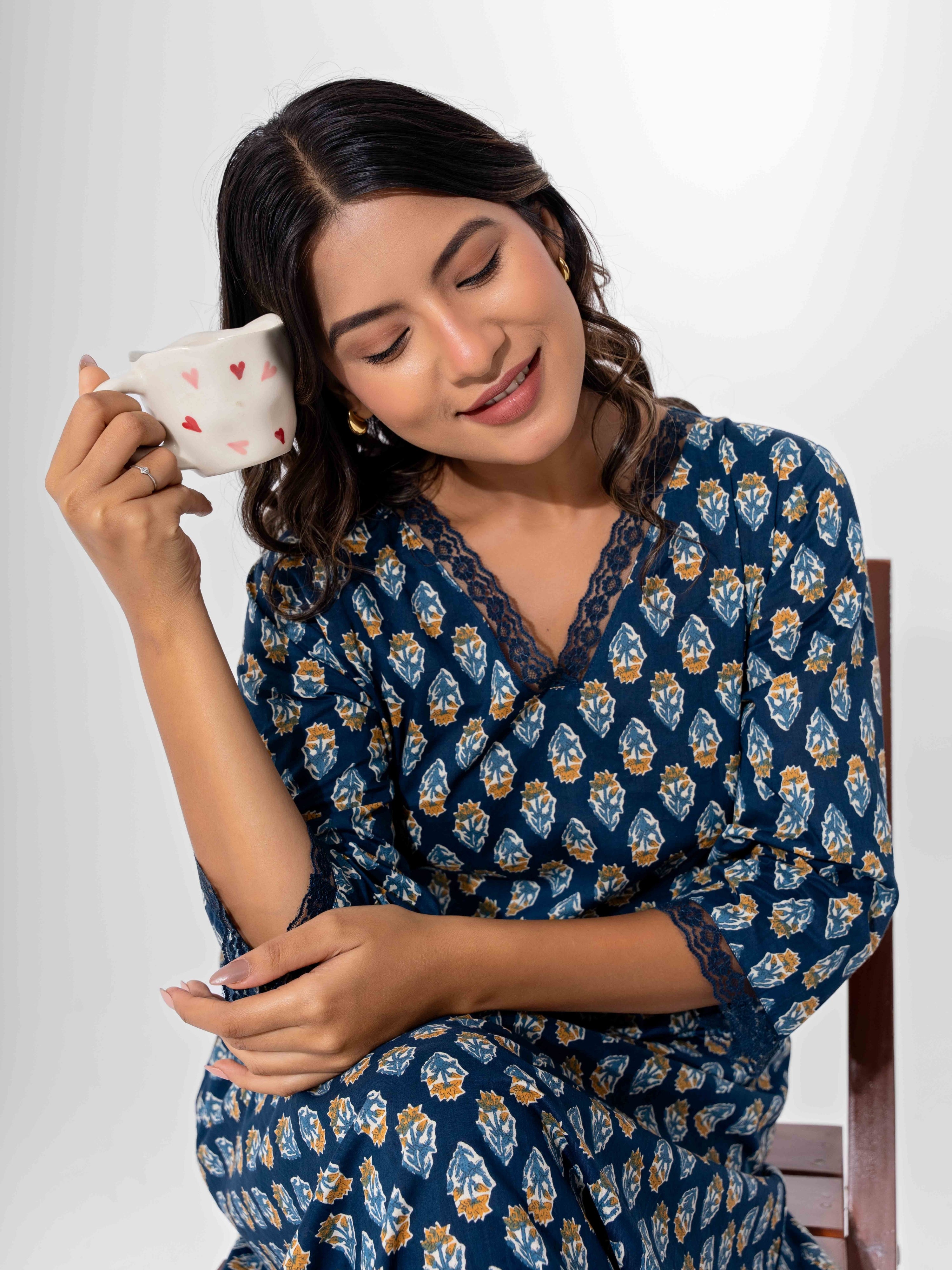 The Blue Buti Pure Cotton V Neck Night Maxi combines playful style with cozy comfort. Made from soft cotton, its flattering V-neck and charming blue buti print make bedtime fun and fresh.