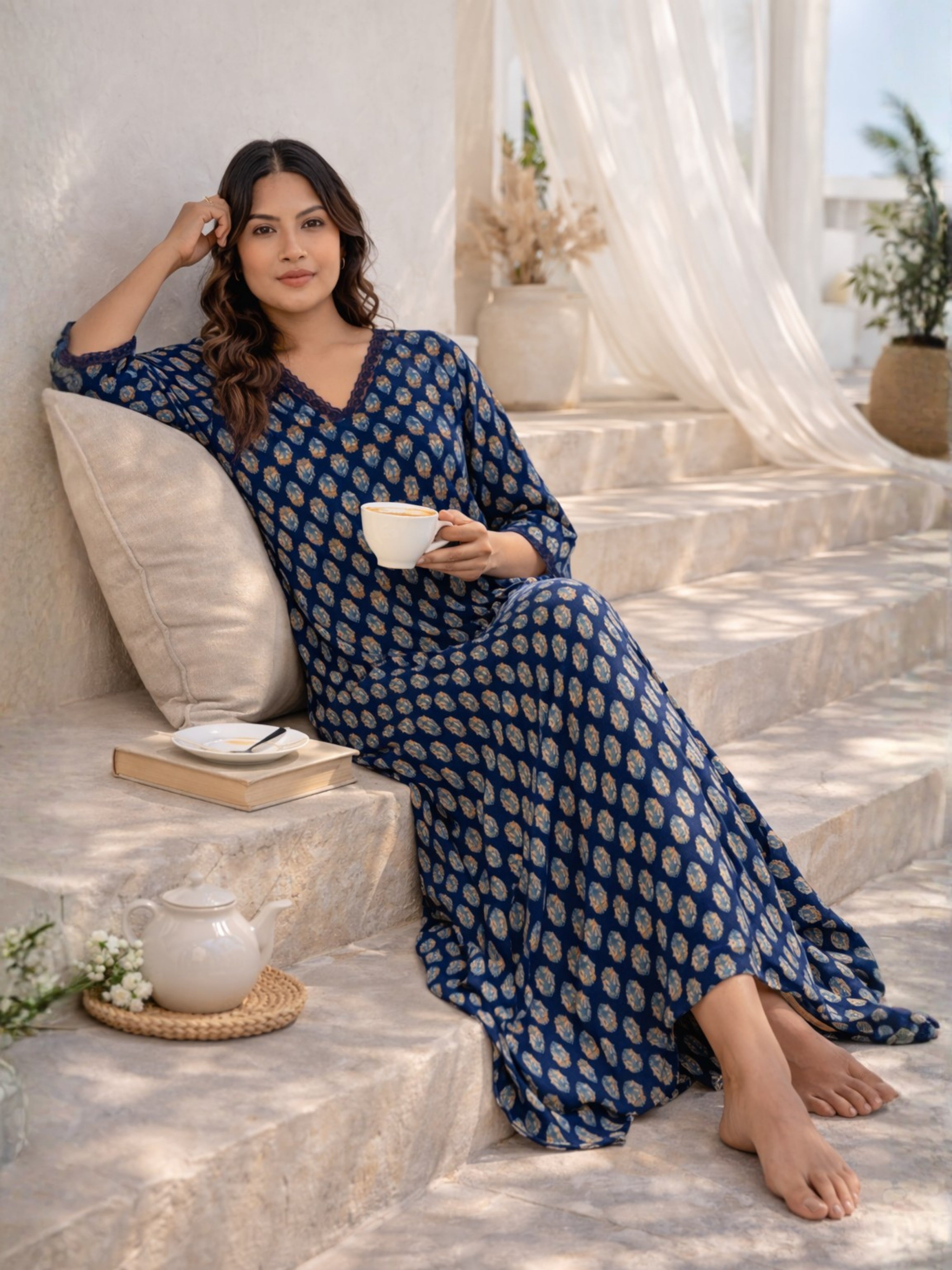 Blue Buti Pure Cotton V Neck Night Maxi