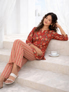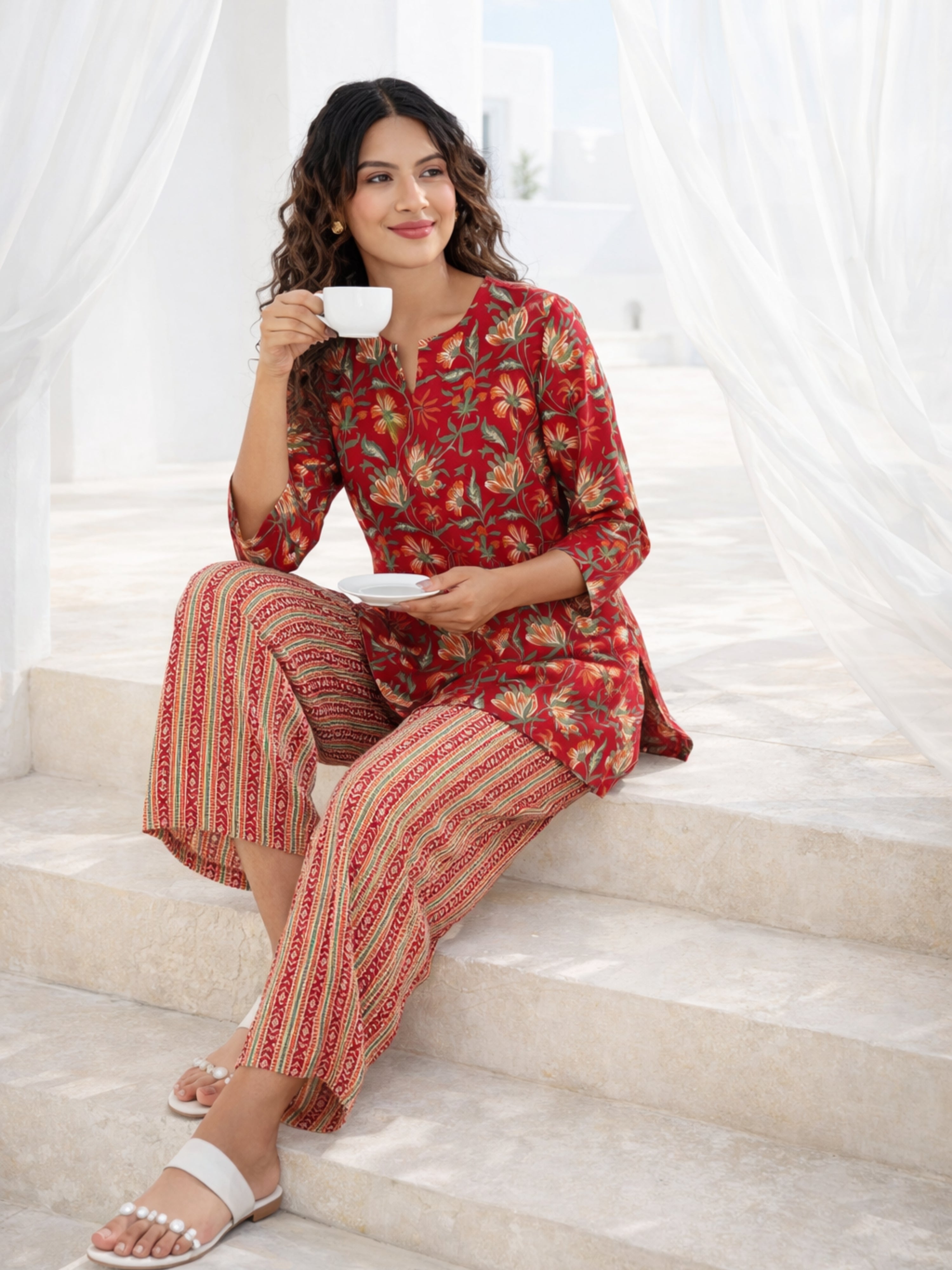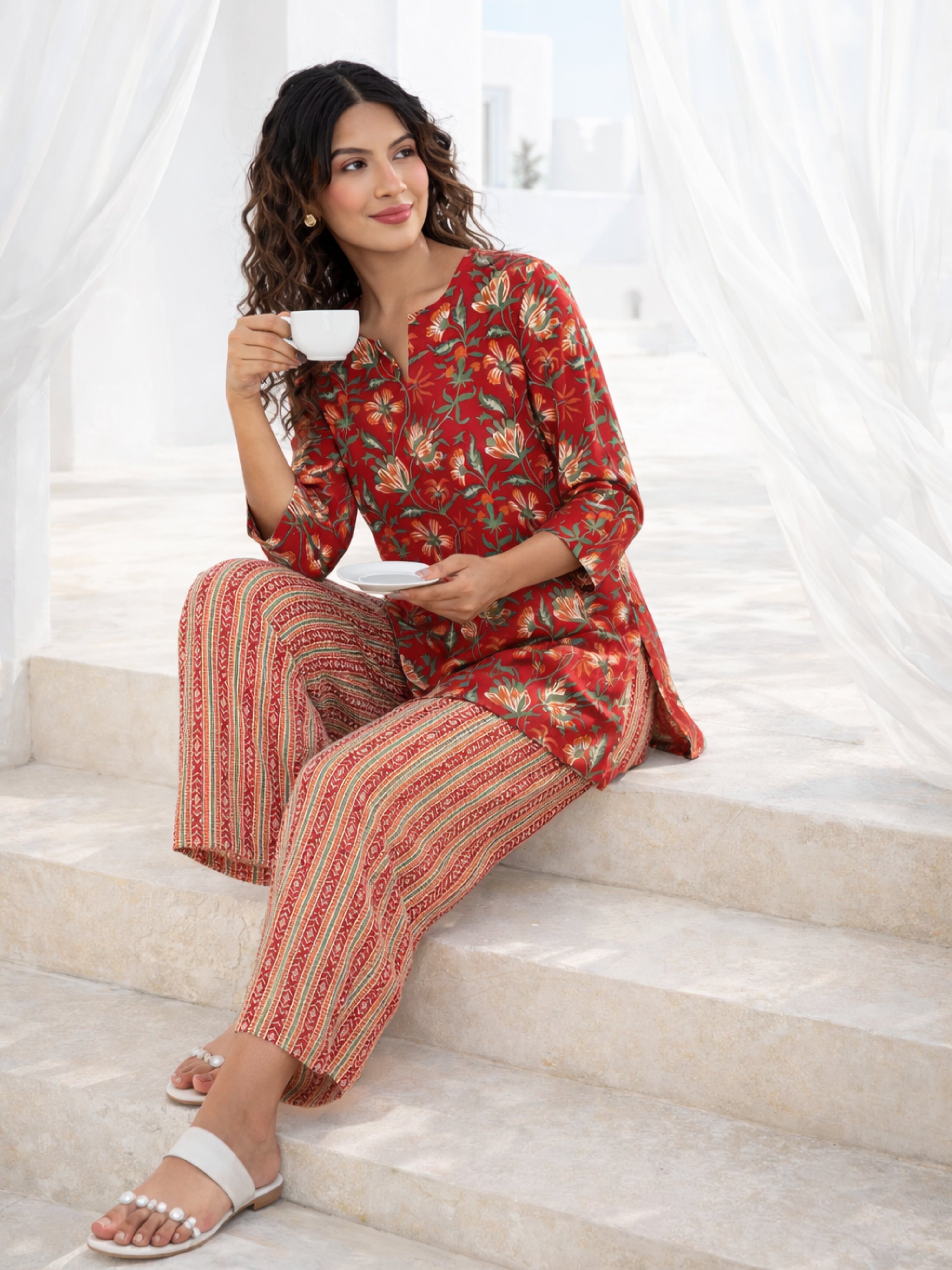 Red Nazakat Pure Cotton Round Neck Co-ord set