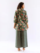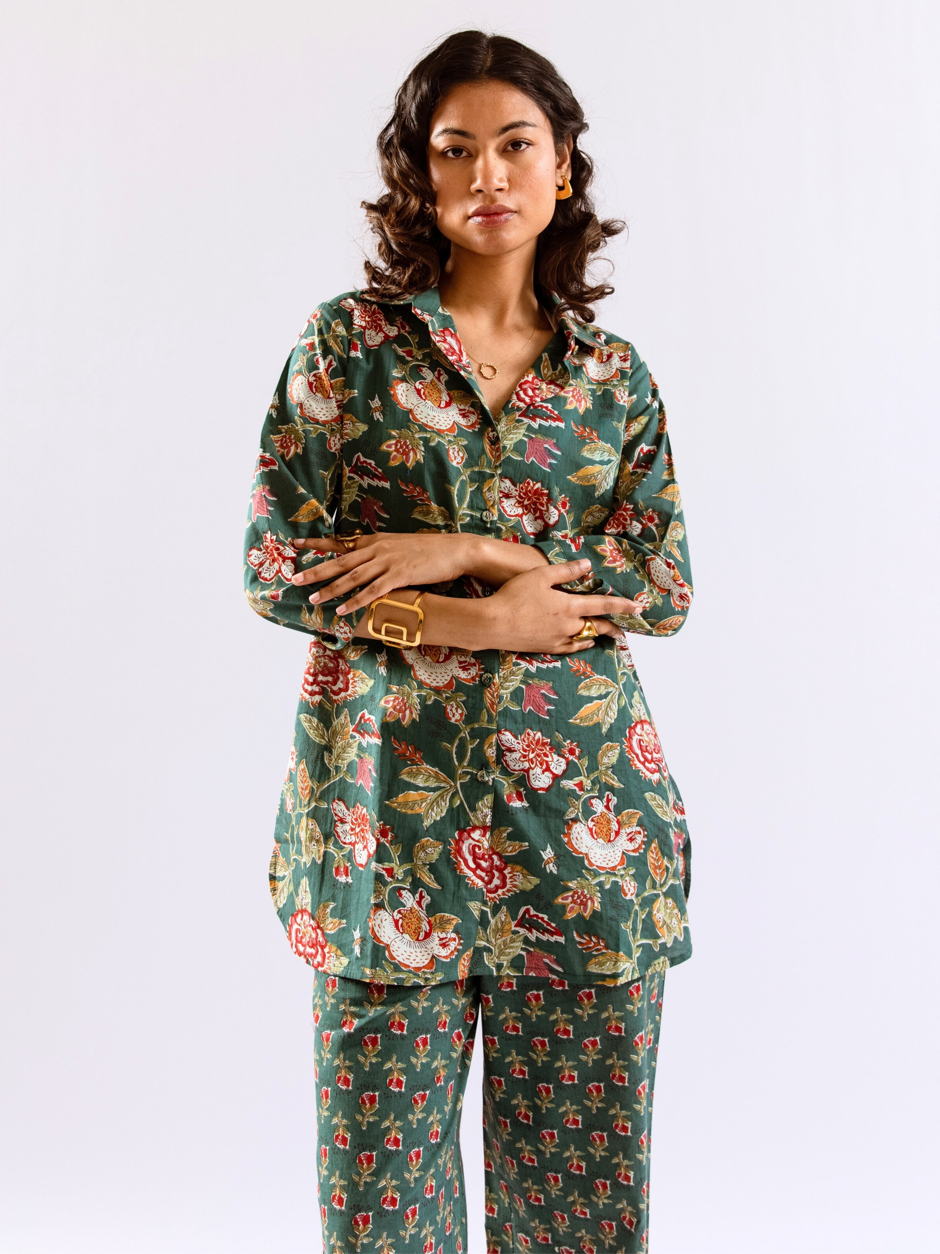 Green Leafy Charm Print Pure Cotton Collar Shirt Co-ord set