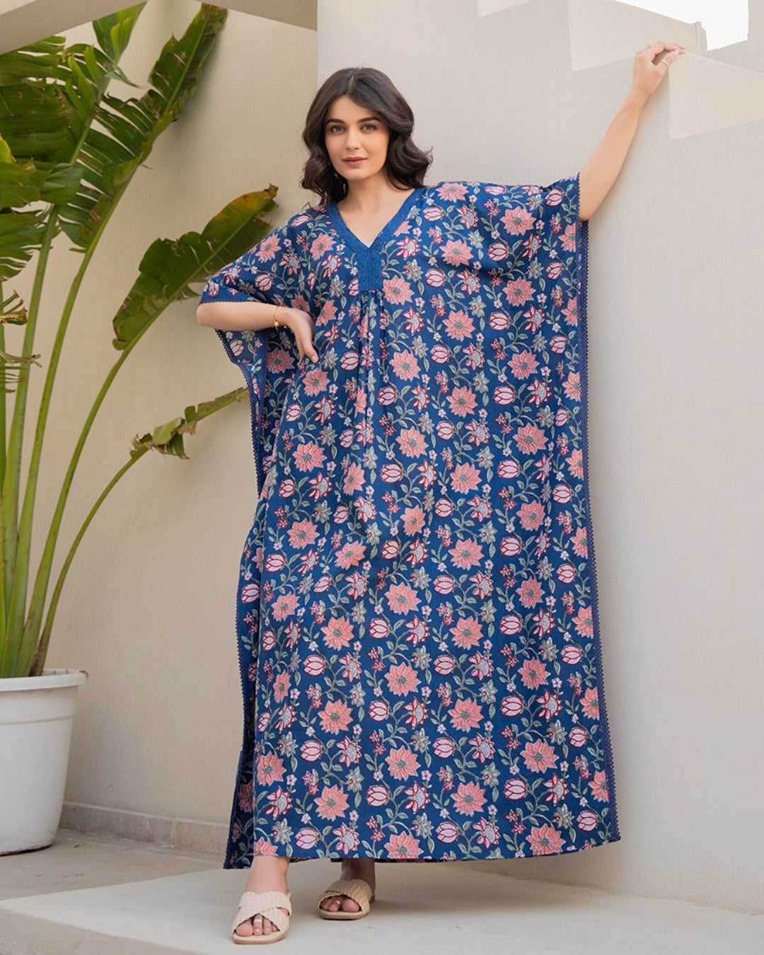 Blue Jaal Pure Cotton Tieup Square Neck Night Maxi