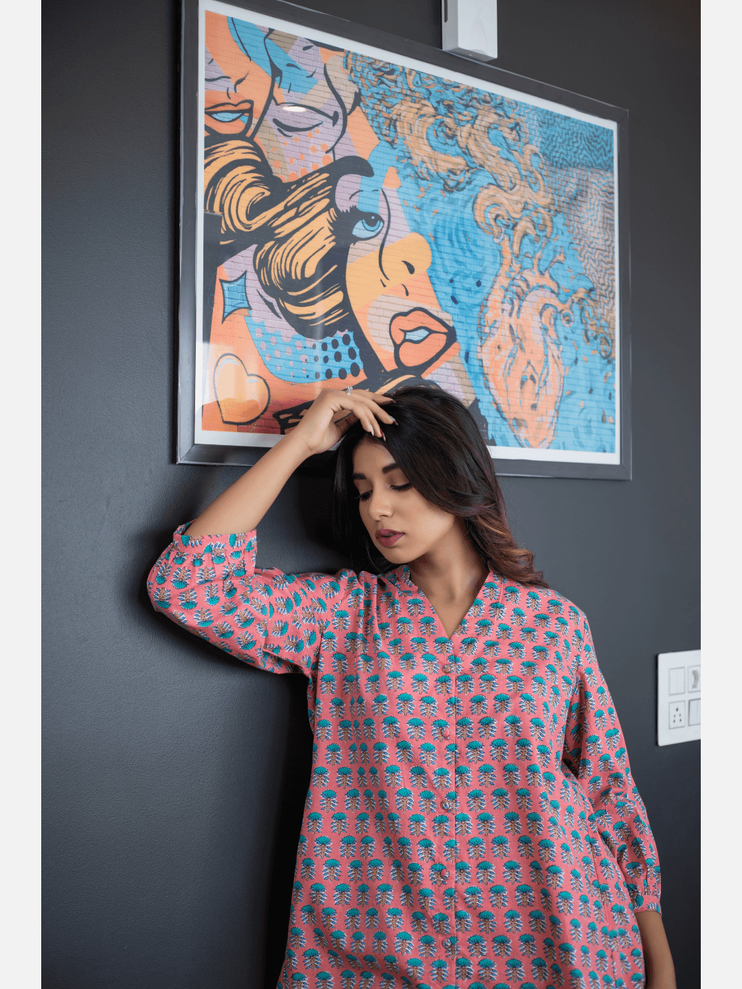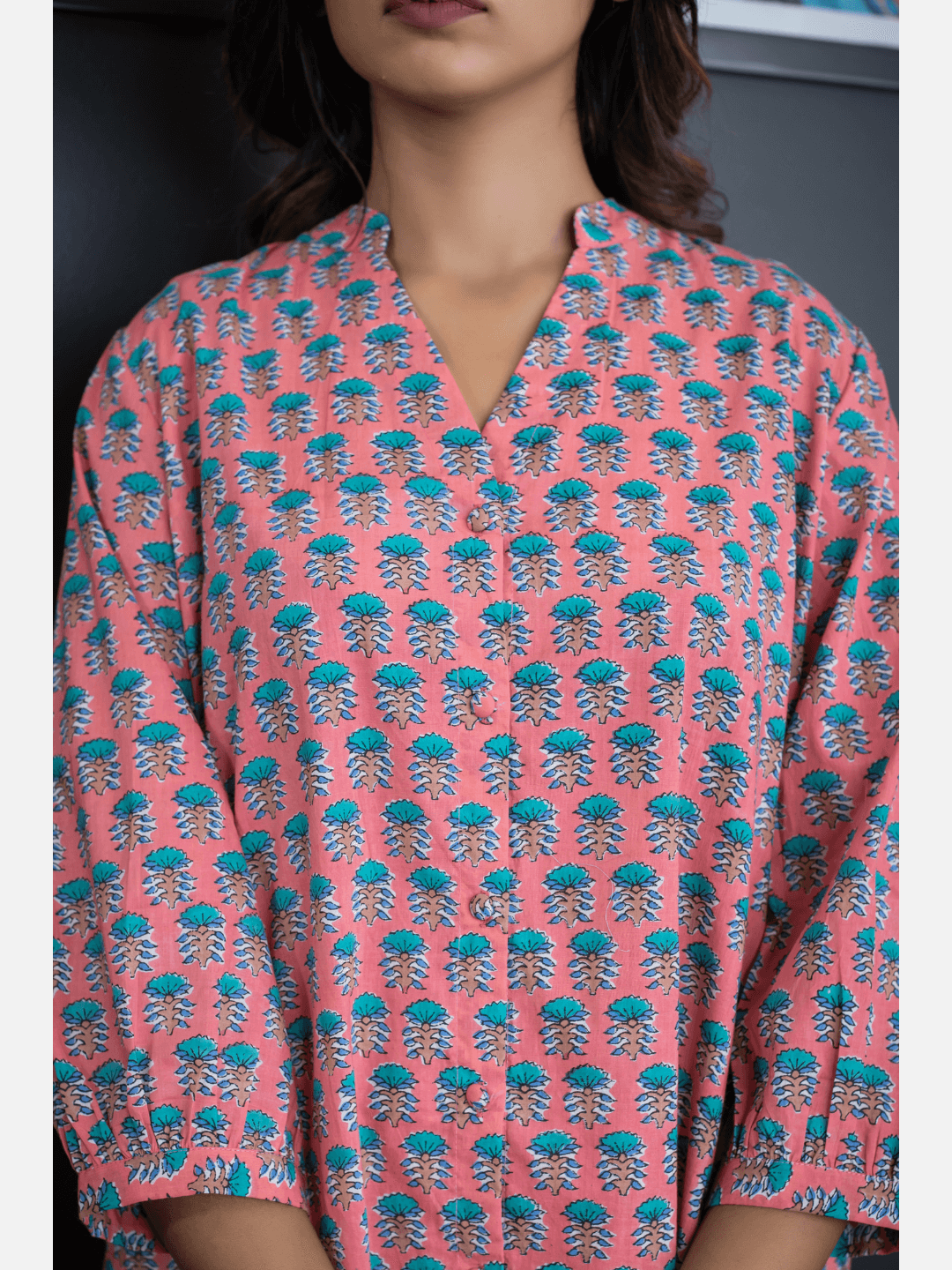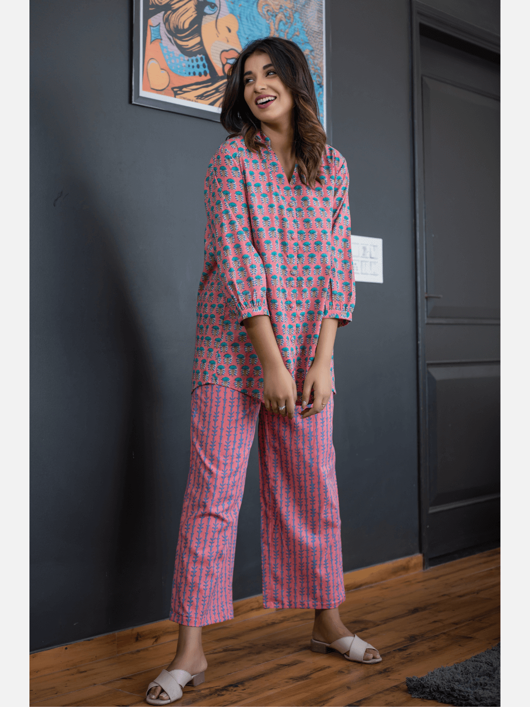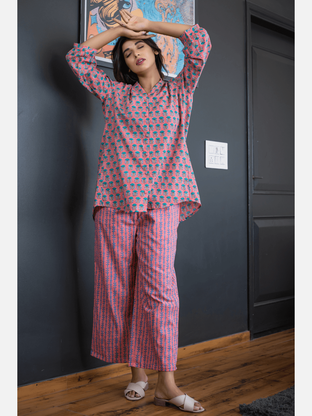 An ideal choice for your loungewear wardrobe, the Cotton Set comes in a soothing color palette. The hand block-printed pattern of the breezy Cotton top complements the matching Pants perfectly.