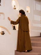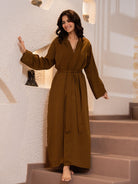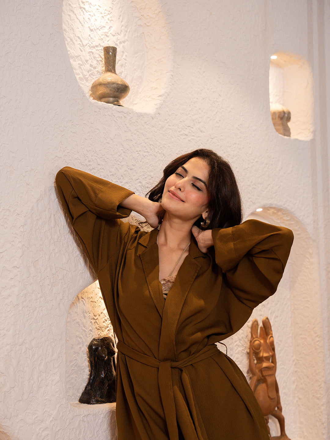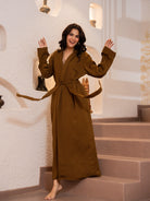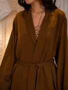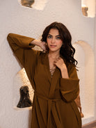 Indulge in luxurious comfort with this chocolate brown soft crepe robe. Perfect for lounging or as a cover-up after a relaxing bath, this robe is both stylish and cozy. Treat yourself to a little touch of indulgence.