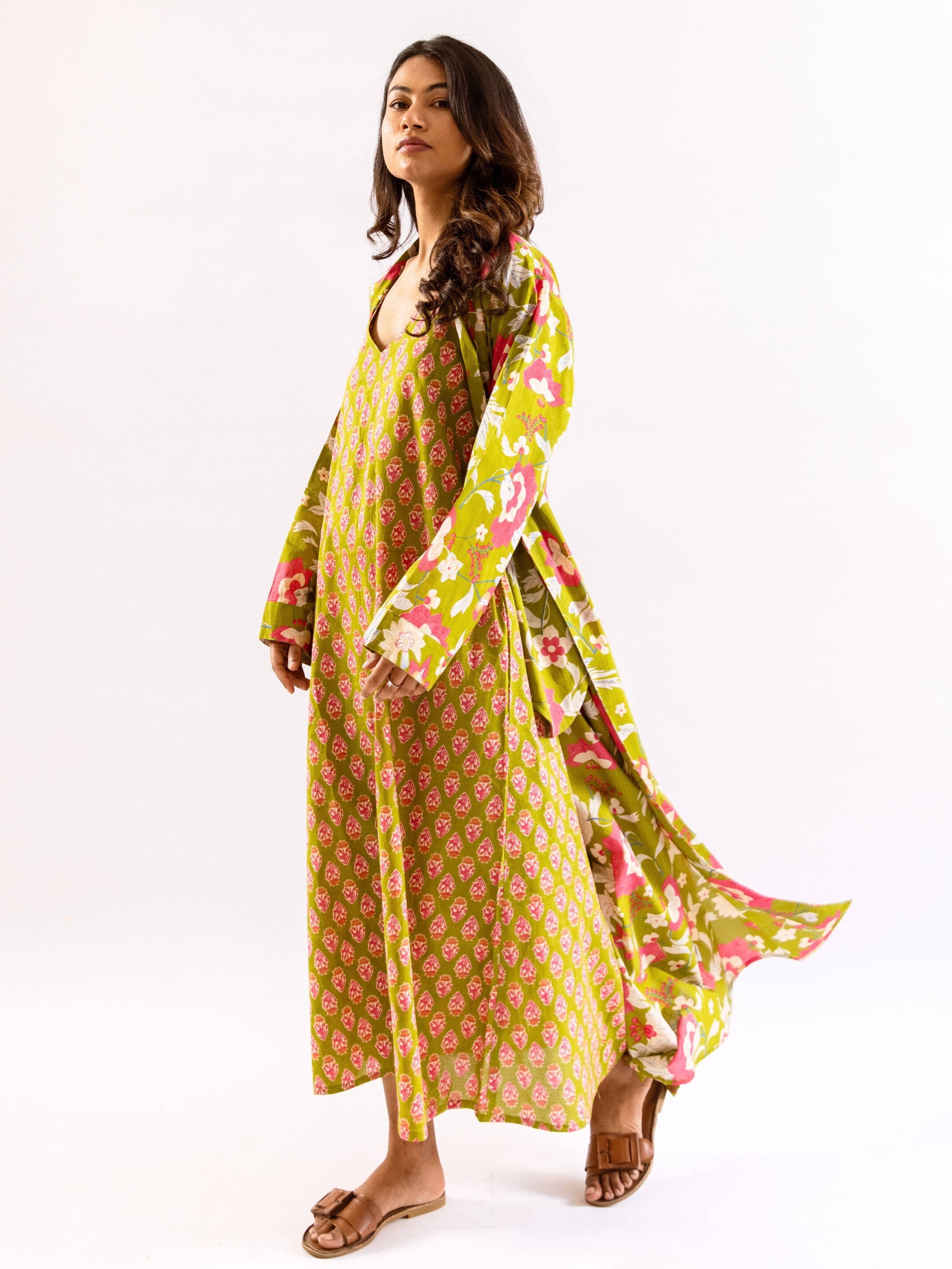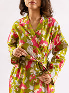 Lime Green Sassy Citrus Pure Cotton V neck Sleepwear Robe Set