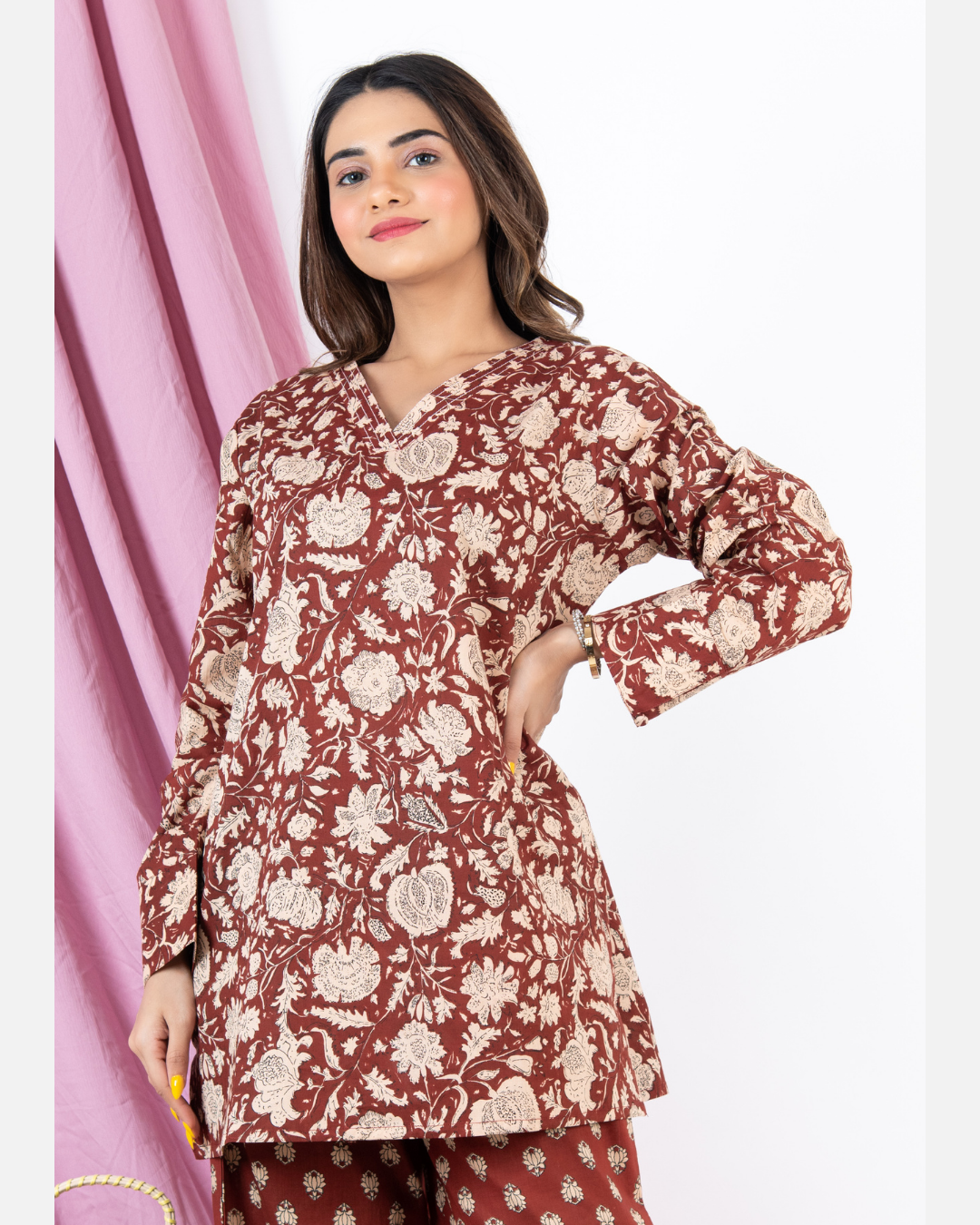 An ideal choice for your loungewear wardrobe, the Cotton Set comes in a soothing color palette. The hand block-printed pattern of the breezy Cotton top complements the matching Pants perfectly.