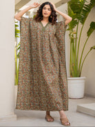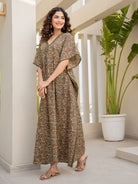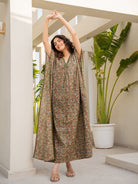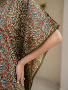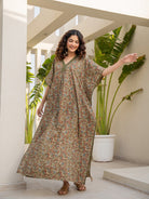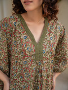 Uplift your fashion sense by getting them this comfy Hand Block Printed Cotton Kaftan. It features an all-over hand block print, a V neckline, elbow-length sleeves, and Lace detailing.