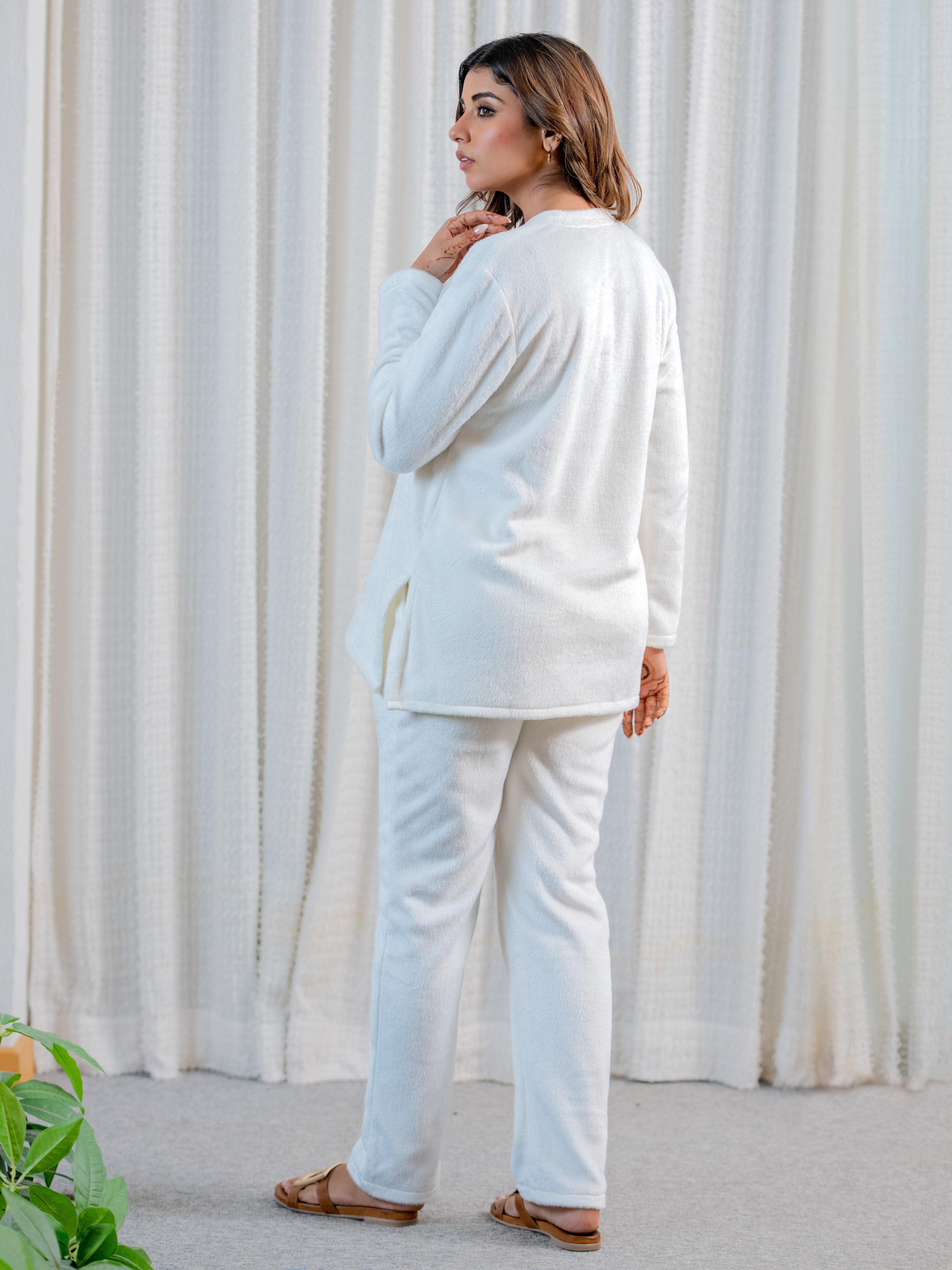 Elevate your comfort game with this pristine white woollen lounge set! Featuring a flattering V-neck and cloud-soft fabric, it's your ticket to effortless elegance. Perfect for cozy nights in or casual outings—this versatile piece keeps you feeling fabulous and relaxed!