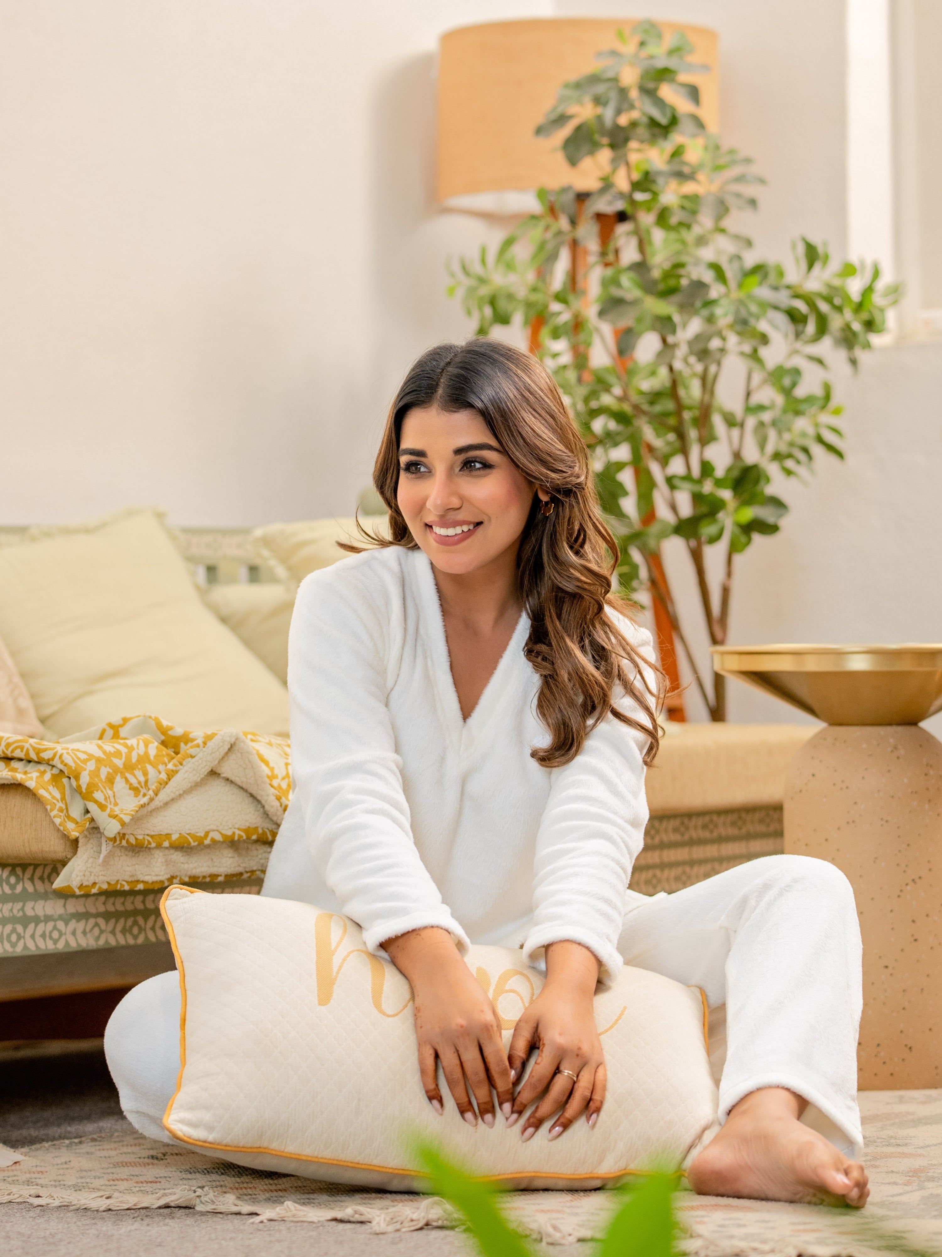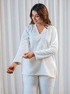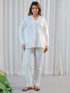 V neck Super Soft White Woollen Lounge Wear Set